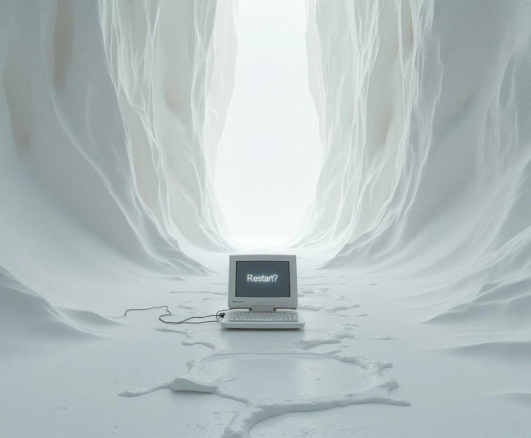 at the end of the universe, there exists a white void of nothingness a computer prompt in the void has a prompt that says "Restart?" Weirdcore aesthetic, universe abruptly cuts off into the pure white void.