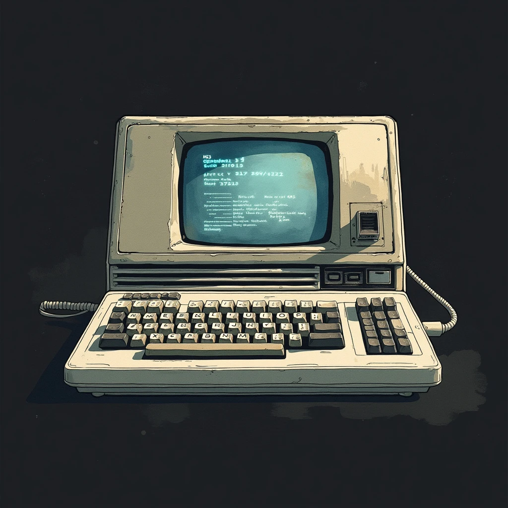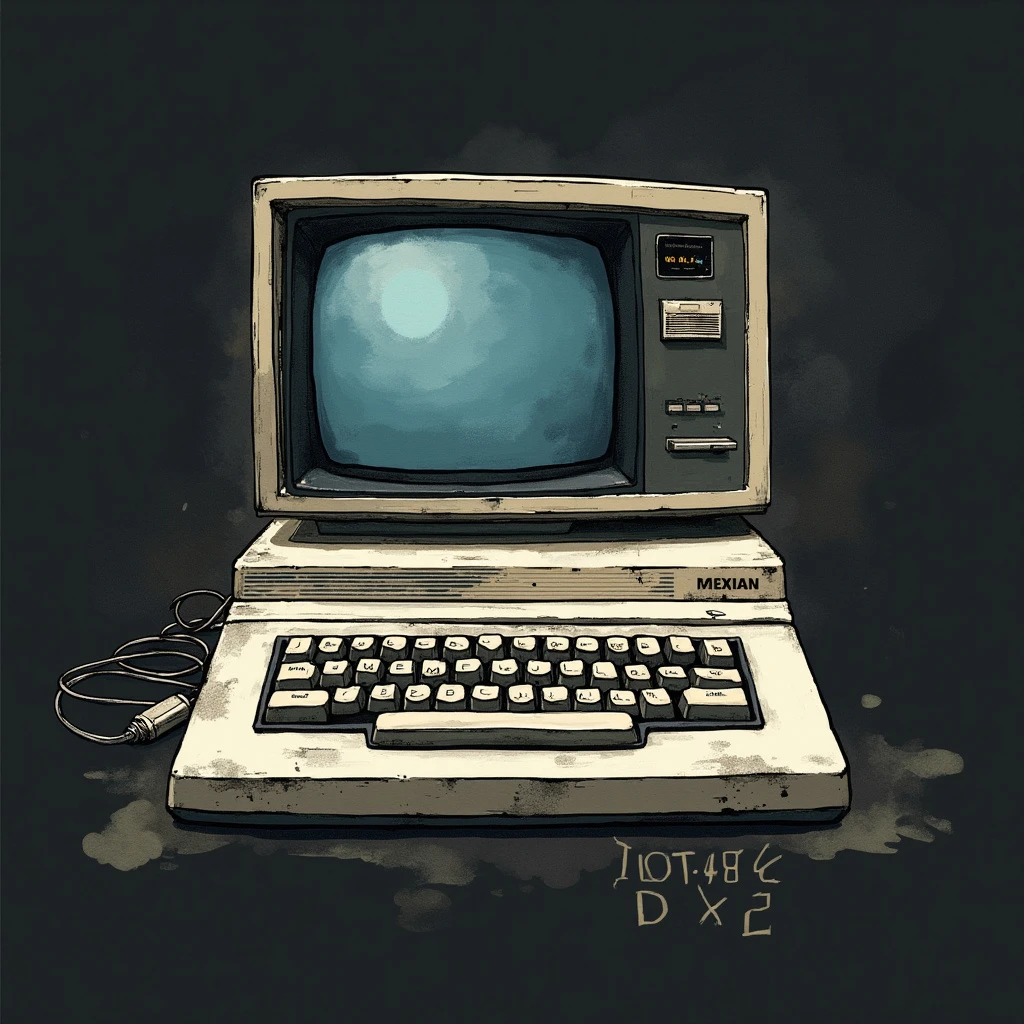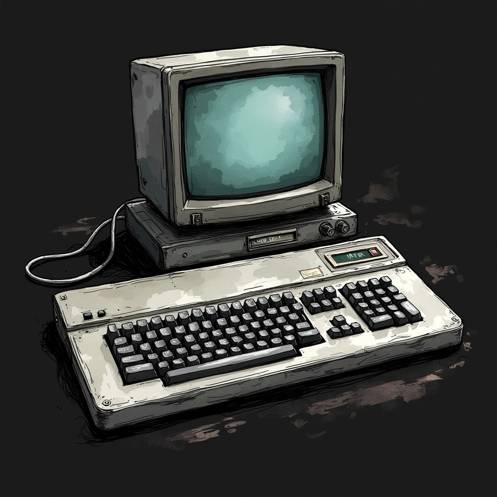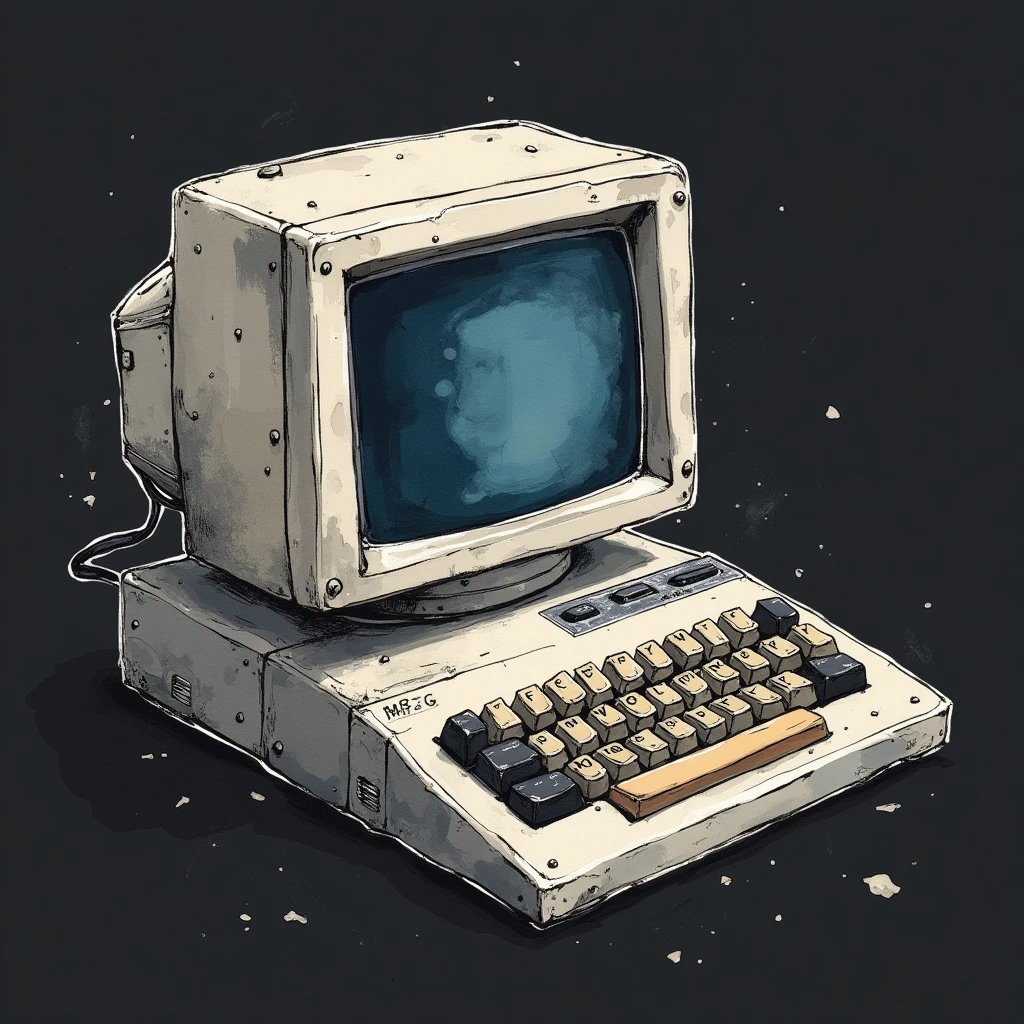 black background dark watercolor rough stroke super dieselpunk amazing retro fantasy computer mechanical mixed with a small black and white keys strings, mmx pentium PC white, lineart, watercolor, flatart, dark lighiting effect. There is a retro text: "Intel i486 DX2"