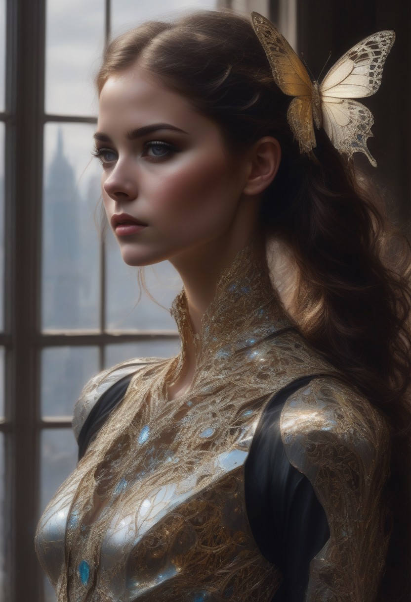 In Casey Baugh's evocative style, art of a beautiful young girl cyborg with long brown hair, futuristic, scifi, intricate, elegant, highly detailed, majestic, Baugh's brushwork infuses the painting with a unique combination of realism and abstraction, greg rutkowski, surreal gold filigree, broken glass, (masterpiece, sidelighting, finely detailed beautiful eyes: 1.2), hdr, realistic painting, natural skin, textured skin, closed mouth, crystal eyes, butterfly filigree, chest armor, eye makeup, robot joints, long hair moved by the wind, window facing to another world, Baugh's distinctive style captures the essence of the girl's enigmatic nature, inviting viewers to explore the depths of her soul, award winning art <lora:aesthetic_anime_v1s:1>