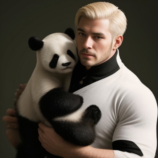 Blond Mature Male Tall Bodybuilder Hugging A Giant Panda, 1man, 1animal, Male Focus, Animal Focus, (blonde hair), Short Hair, Mature Male, 40-year old, Chiseled Face, Masterpiece, Giant Panda