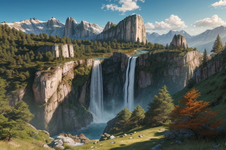 ((overlooking an exotic alien alpine landscape)), ((rocky cliffs)), ((waterfall)), ferns, small bushes, overground grass, pine trees, sky is a mix of blue and orange tints, grassy rocky ground, extremely detailed, 8k, high quality, Source_photo, real photo, sharp,