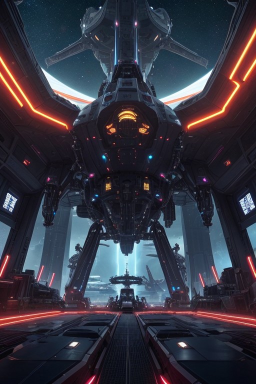 score_9, score_8_up, score_7_up, A spaceship with neon thrusters, docking in a massive spaceport, surrounded by bustling alien lifeforms, intricate machinery, (detailed, neon colors, sci-fi, futuristic), wide angle shot, detailed realistic photo