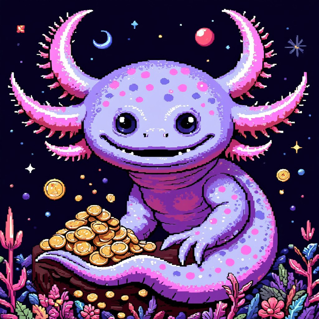 The image is a C64 pixel style illustration of a side scrolling platformer game where an axolotl collects gold coins in Mexico city, pixel art