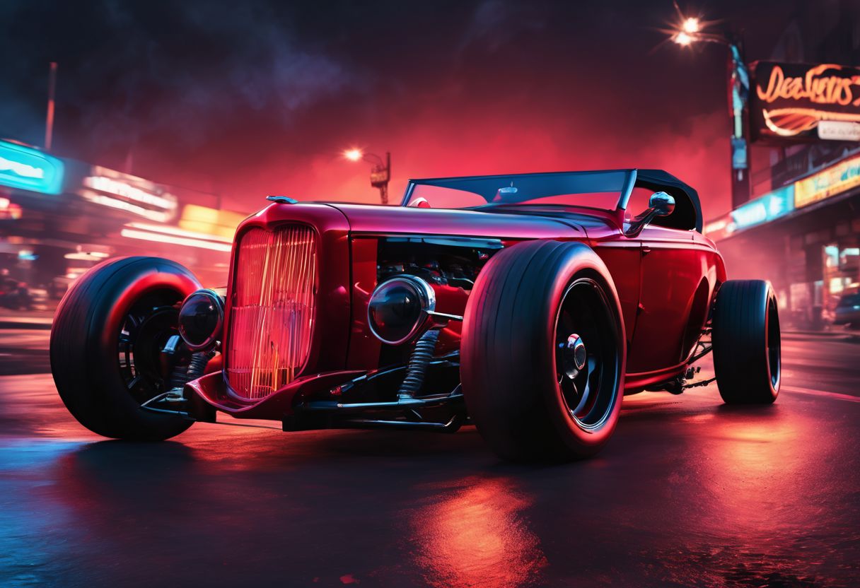 (masterpiece, best quality, ultra-detailed, 8K),50s retro style with modern neon aspect, 1932 Ford Roadster Hot Rod, street racing inspired, LED, ((Twin headlights)), (((Bright flame paint job down the sides of the bright red body of the car))), (Black racing wheels), Wheelspin showing motion, Show car in motion, Burnout, masterpiece, best quality, realistic, ultra highres, (((depth of field))), (full dual colour neon lights:1.2), (hard dual color lighting:1.4), (detailed background), (masterpiece:1.2), (ultra detailed), (best quality), intricate, comprehensive cinematic, magical photography, (gradients), glossy, Night with galaxy sky, Fast action style, fire out of tail pipes, Sideways drifting in to a turn, flame paint with on candy apple metal flake red painted body, aesthetic,intricate, realistic,cinematic lighting,