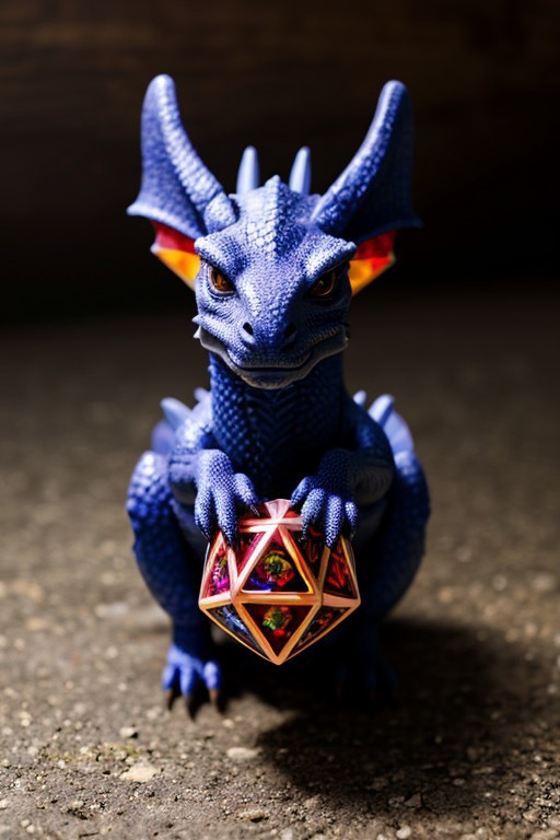 An adorable small indigo dragon sits on a ruby dodecahedron, glowing runes carved in the gem. Dragon wings. Small pointy dragon teeth. Iridescent dragon scales. Glowing orange eyes. Background filled with multicolored gemstones.