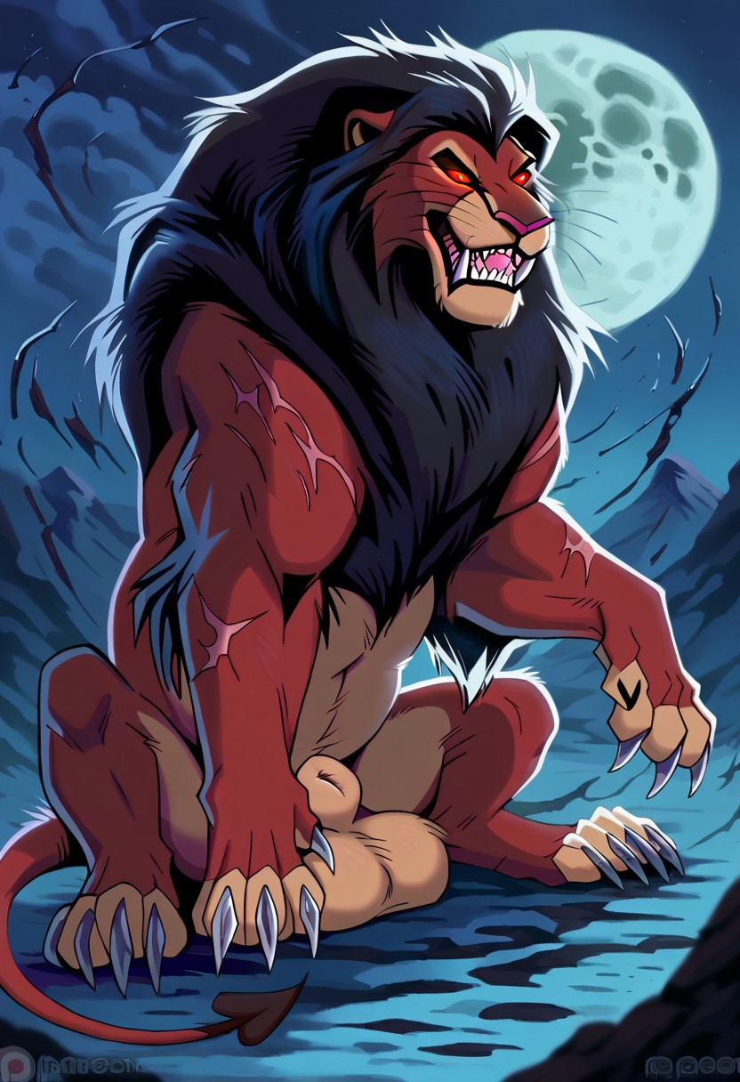 highly detailed 1solo lion, A feral lion, 1boy, feral, demonic lion, broad shoulders, very large, black fur, large white mane of fur, mane going along back, glowing red eyes, piercing eyes, detailed eyes, sharp pupils, demonic horns, demon tail, scars, large lion teeth, sharp fangs, white teeth, steel claws, silky smooth and thick fur, strong, powerful, (huge sheath:1.0), huge balls:0.7, (muscular:1.8), at the top of the mountain, moon, night, solo, beige underbelly, lounging in the moonlight