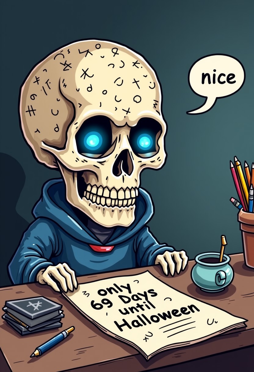 cute illustration of a human skull sitting on a wizard's workdesk, the skull is covered in arcanic runes and has glowing blue orbs in its eye sockets, there is a piece of paper on the table next to the skull that says in cursive text "only 69 days until Halloween", there is a speech bubble coming from the skull that says in small letters "nice"