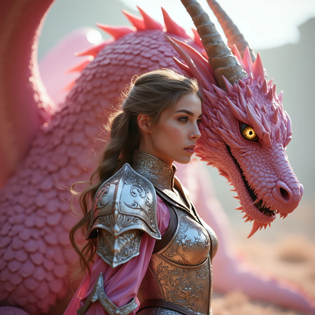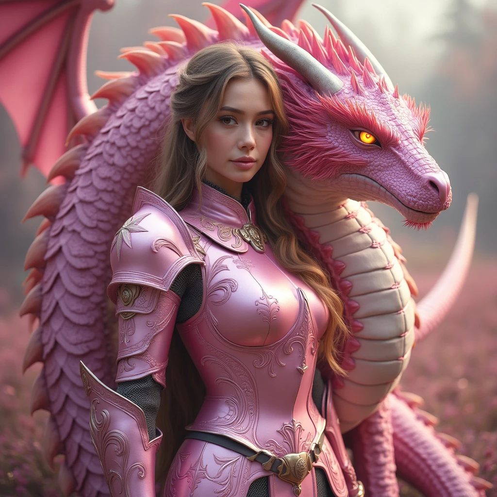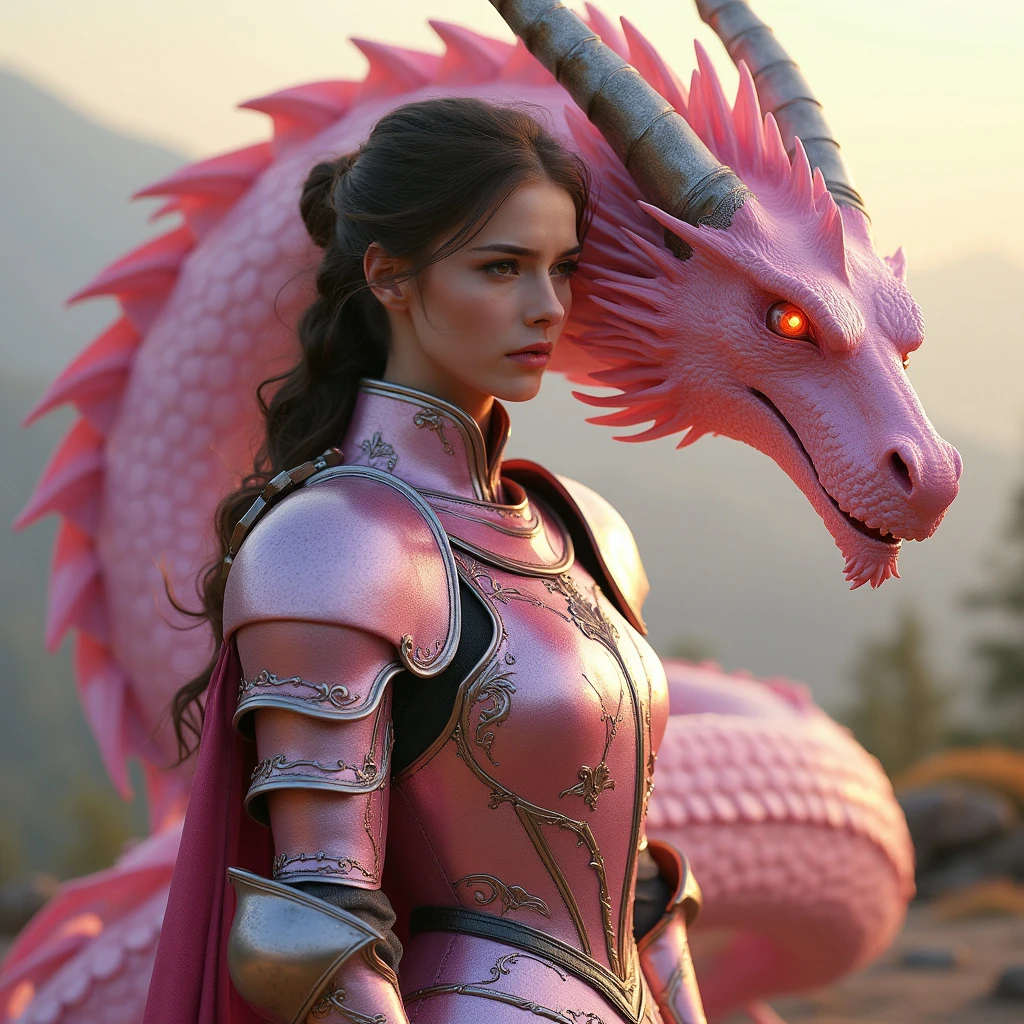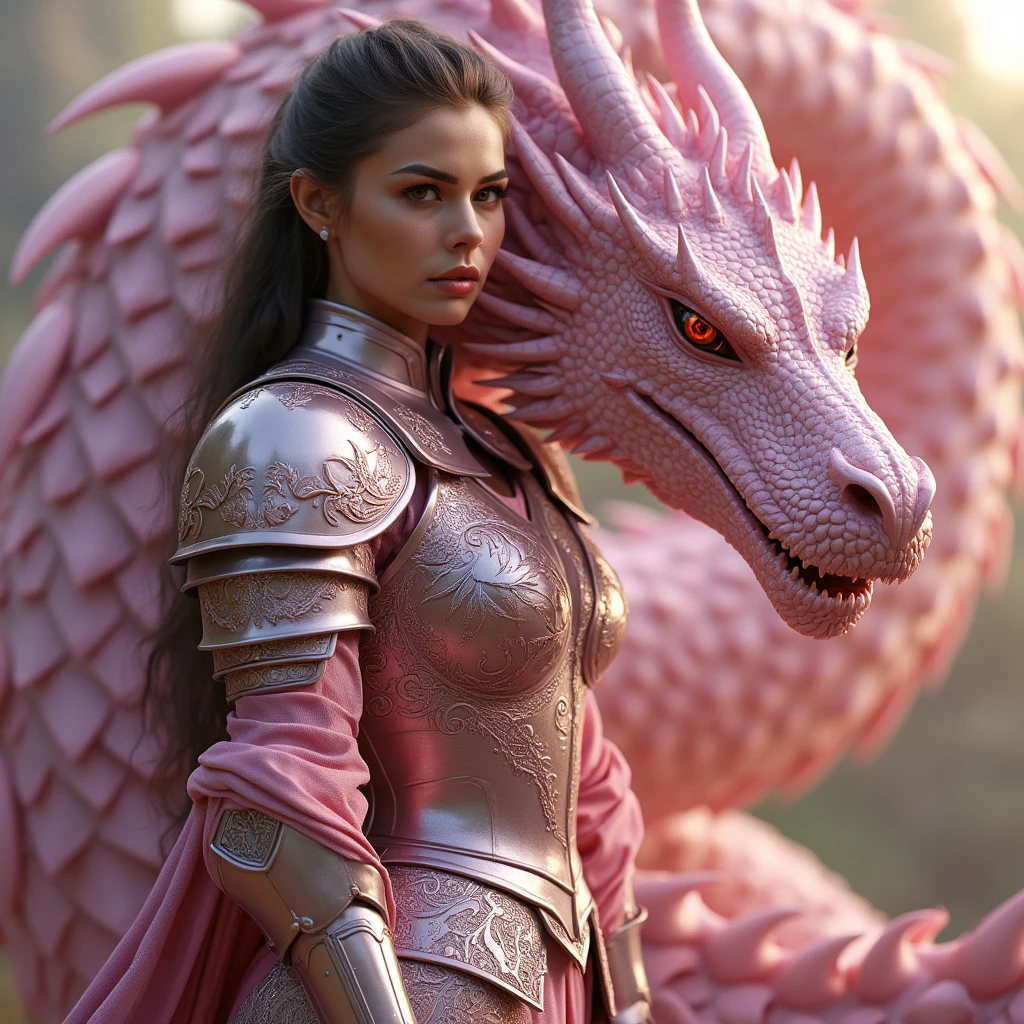 Realistic style] image of a striking female knight clad in shimmering pink plate armor stands proudly beside her fierce dragon, its scales glistening in shades of pink. The knight’s armor is intricately detailed with elegant engravings, reflecting the soft light of dawn. Her dragon, powerful yet graceful, coils protectively around her, its eyes glowing with an intense, fiery gaze. Together, they create a stunning, unbreakable bond, embodying both beauty and strength in a fantastical landscape.