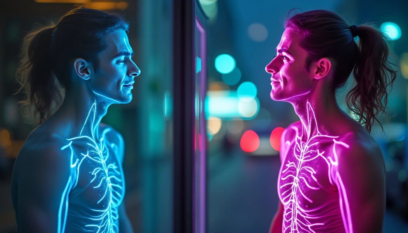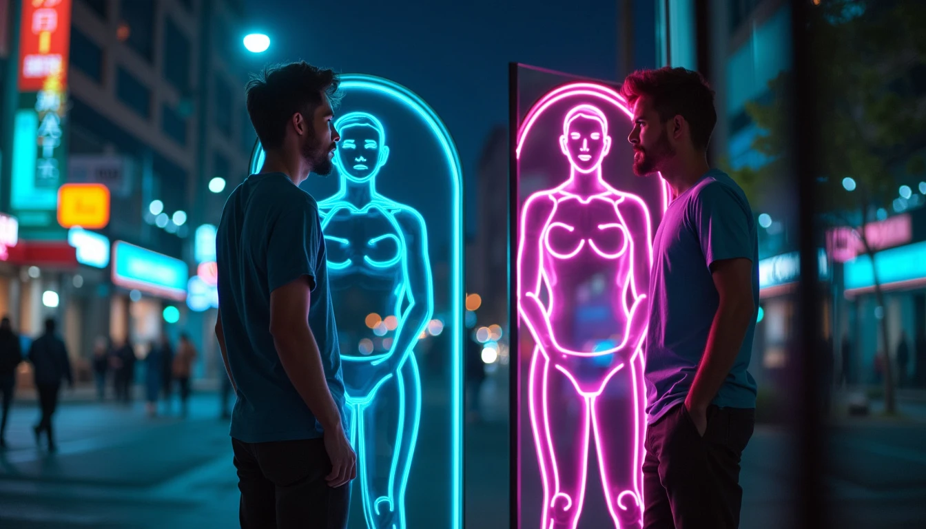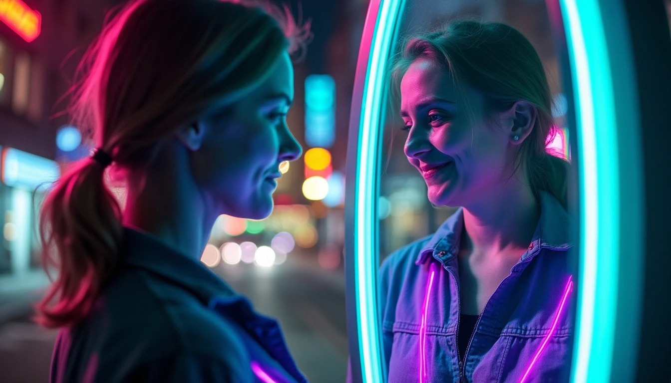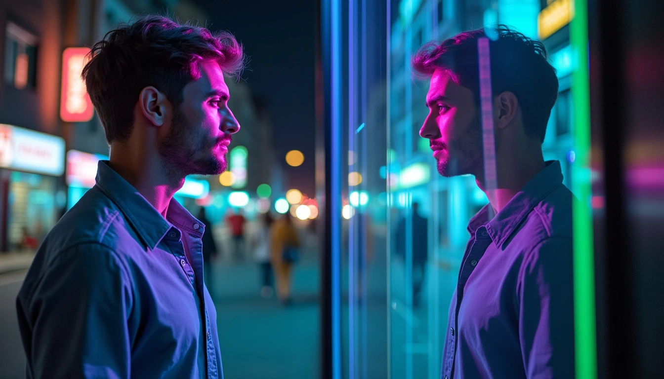 The image is divided into two parts, separated by a mirror. On the left, a person looks at their reflection with a contemplative and worried expression. The body is outlined with neon effects in blue and pink, symbolizing feelings of uncertainty and introspection. In the mirror reflection, on the right, we see a different version of the person: more confident, smiling and with an upright posture. This reflection is highlighted with a neon glow in green and purple, representing success and self-confidence. The background of the image is a nighttime urban environment, with neon lights that create a vibrant contrast between the two parts, highlighting the idea of comparison and the desire for personal growth. The scene captures a moment of internal reflection and the struggle to achieve a better version of oneself.