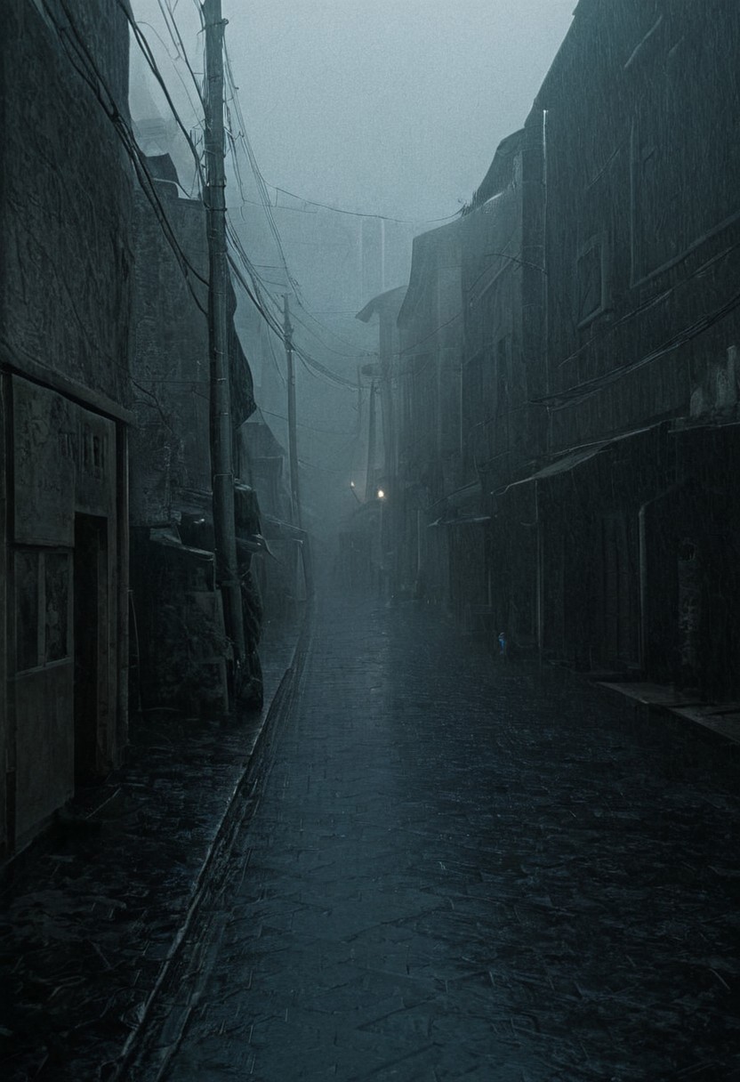 novuschroma38 style, Radiant Darkness, ink splatters, eerie, BREAK, crowd of murky characters slouching in the empty street, desolated town, heavy rain, street view