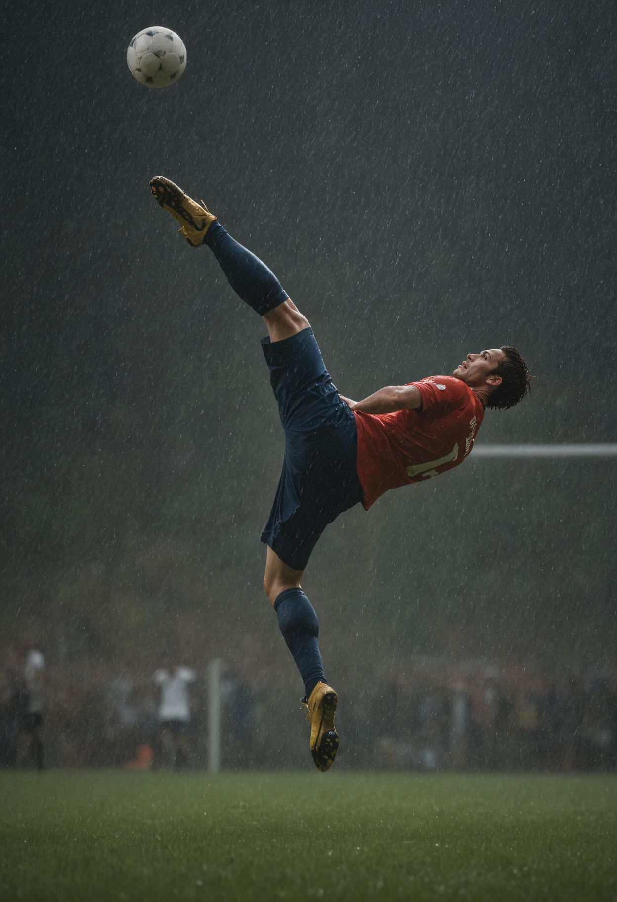 realistic image of a soccer player doing a bicycle kick in a rainstorm. high quality, hyperrealistic, cinematic lighting, depth of field, 8k resolution