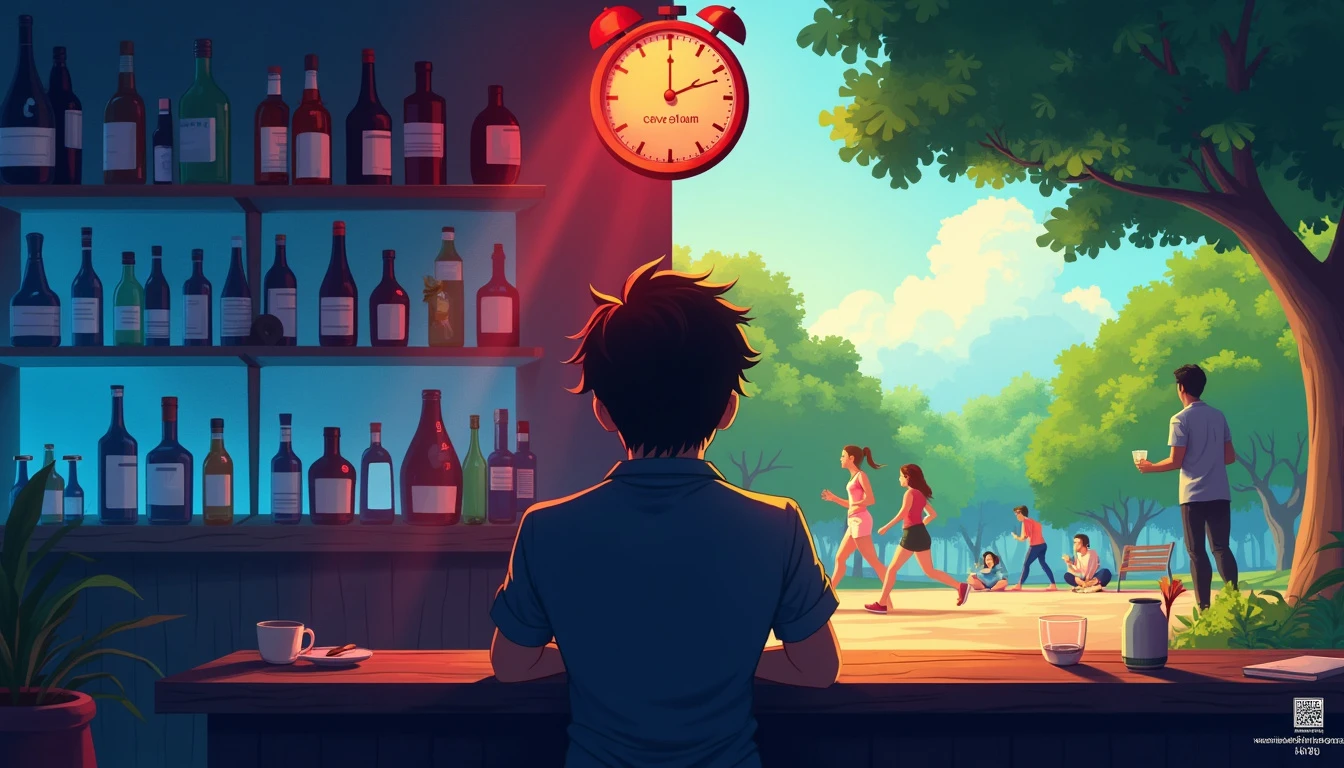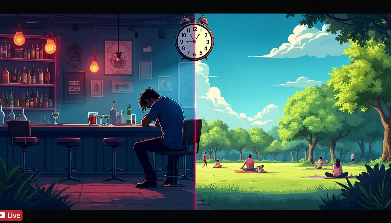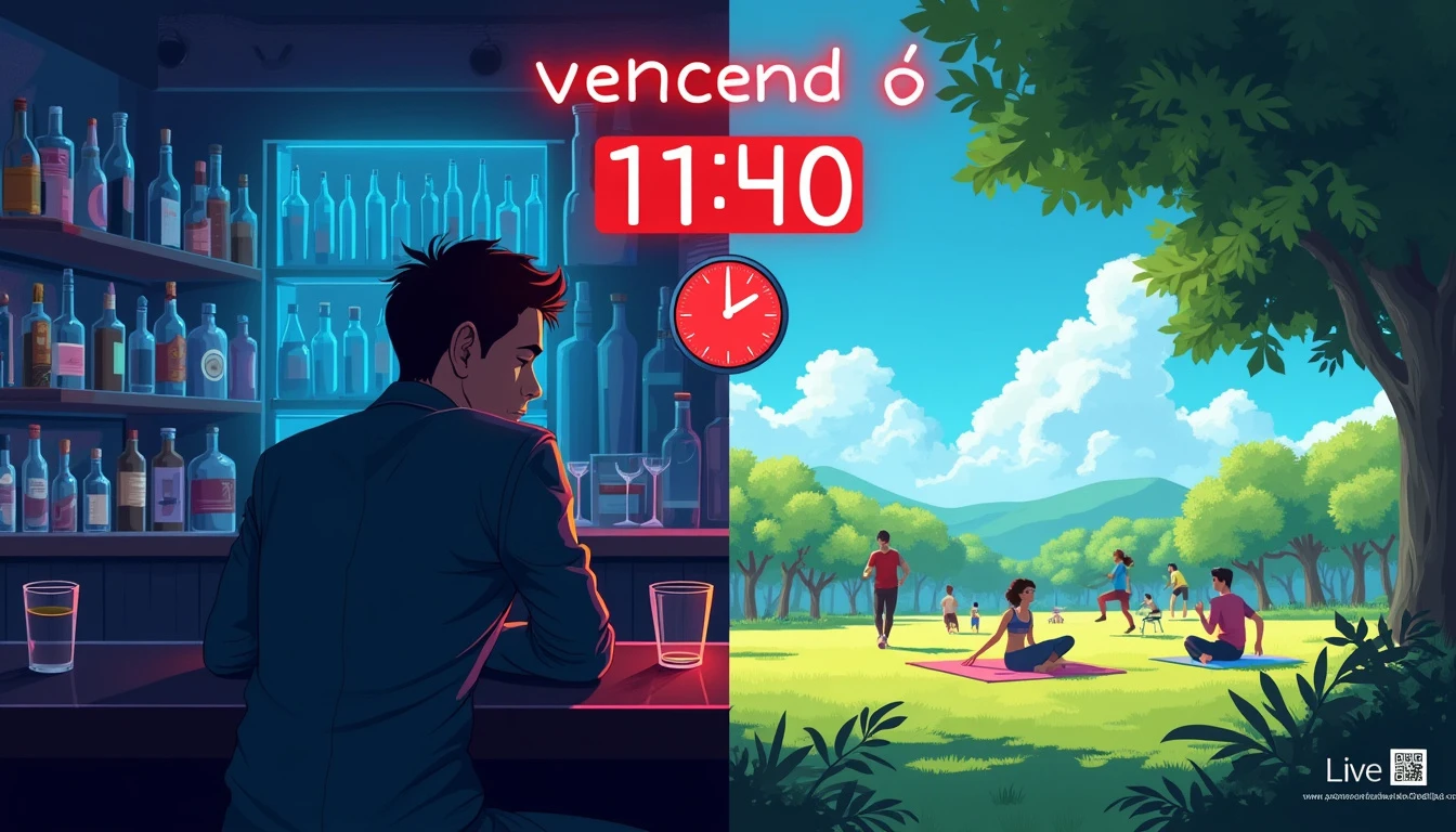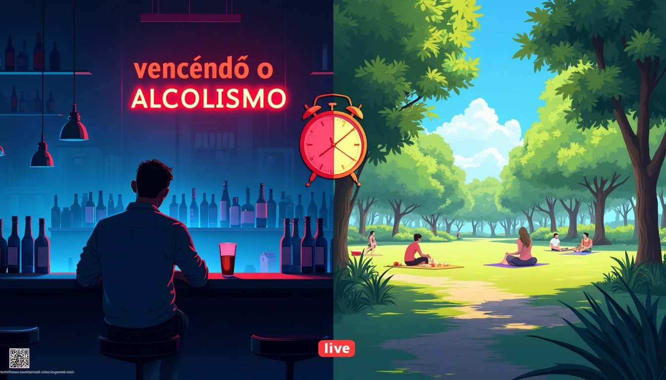 An image divided into two parts, representing the contrast between alcoholism and recovery, suitable for a YouTube live thumbnail. On the left: A dark and gloomy bar environment, illuminated by blue and red neon lights. Partially blurred bottles of alcohol in the foreground. A solitary silhouette sitting at the bar, head down, with a half-empty glass in front of him. On the right: A sunny scene in a park, with people doing healthy activities such as yoga, running or picnicking. Bright and vivid colors, with predominant shades of green and blue from the sky. In the center of the image, dividing the two scenes, a stylized clock showing 'Sunday, 11:40 PM', indicating the time of the live. At the top, in large and striking letters: 'VENCENDO O ALCOOLISMO'. The text has a color gradient, going from dark red (bar side) to light blue (park side). In the bottom right corner, a small 'LIVE' icon in red, typical of YouTube broadcasts. In the bottom left corner, a discreet QR code that leads to help resources for alcoholics. The entire image has a slight grainy effect, giving a sense of realism and depth."