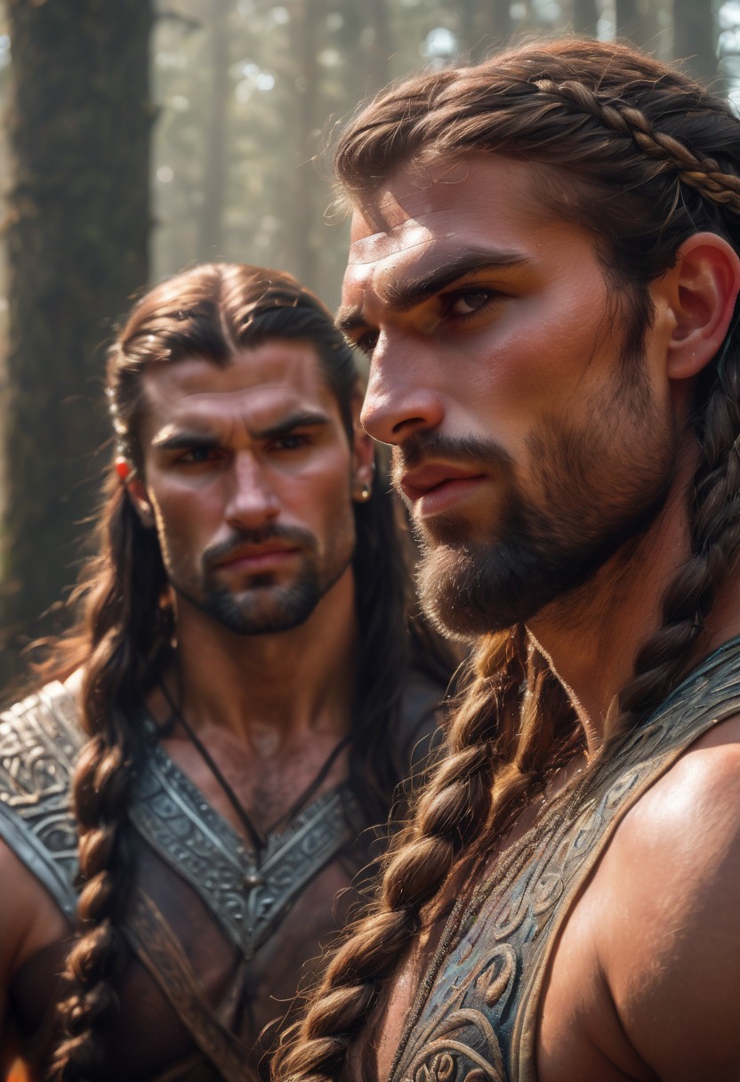 fantasy romance by gaston bussiere and ivan bilibin, russian slavic musclechub and rugged viking warrior, males lovers, detailed face, braids, perfect eyes, under Tyndall light effect, Depth of field