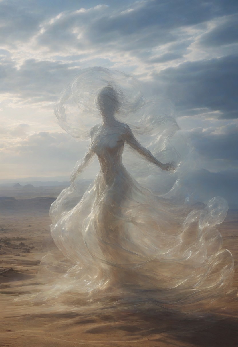 a stormy scene with lightning in the background, in the center of the image is a large glass sculpture of a woman levitating high in the sky, the glass woman is glistening in the sunlight against the storm, inside the glass sphere an air elemental which looks like smoke, the glass woman is levitating in mid air and is surrounded by a veil of smoke, stormy sky with lightning in the background, looking up at the glass sphere with the ground far below