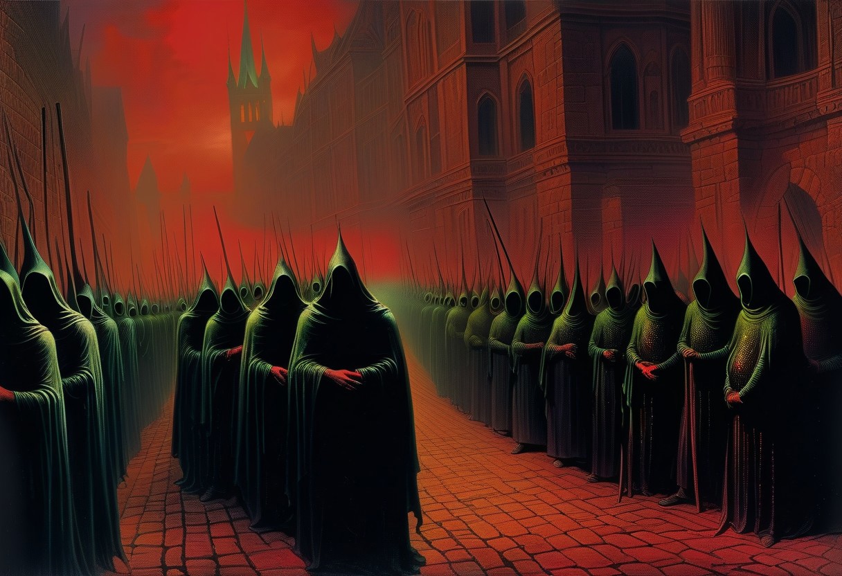 Masterpiece Siege of Budapest, (group:2), (under black flags:1.1), Muslim terror, people impaled, armor, worm metal best quality, masterpiece, paranormal, transcendental, mysterious, aesthetic, glow concept art, impressionism, (acid bleeding deep colors:1.1), leaking, evil energy, no gradients inspired by Francisco Goya, beksiński, eerie atmosphere, dark fantasy, gothic, scary colors, dark atmosphere illustration, painted in high resolution, colorful, vibrant, primary colors, <lora:EldritchCandids1.1.2:0.4> <lora:Gustave Dore Style:0.4> Gustave Dore Style