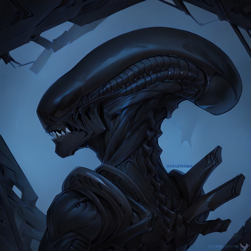 ((source_furry, score_9, score_8_up, score_7_up, score_6), male focus, solo, athletic male, dark theme, low light), score_5, score_4_up, ((xenomorph)), ((black body, slimy, white stripes)), (headshot portrait)