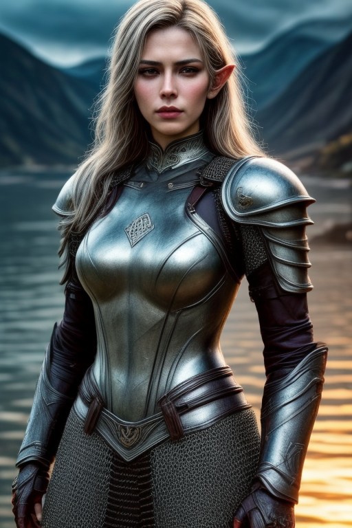 (masterpiece:1.2), (best quality,:1.2), 8k, HDR, ultra detailed, ((photorealistic)), cinematic lighting, beautiful mature elf woman, warrior, MetAr, cowboy shot, wearing intricate metal plate armor and chainmail armor, fully clothed, perfect face, perfect hands, eye contact, realistic face, realistic eyes, sunset over scandinavian fjord,