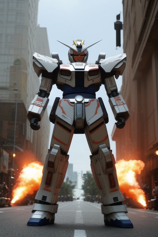 city ruin, explosion, mess, chaos, (heavy bag, gatling gun)(uzumaki naruto, helmet, tokusatsu, belt, a black and silver, destoryMode) tank , negative_hand, Fixhand, mecha, absract art, tankhead, gundam, standing, pose, humanoid, tankhead