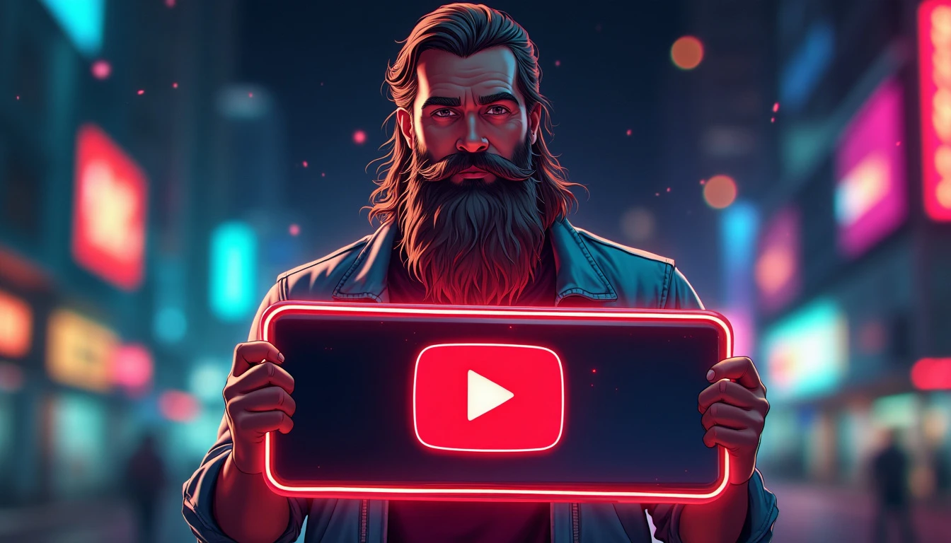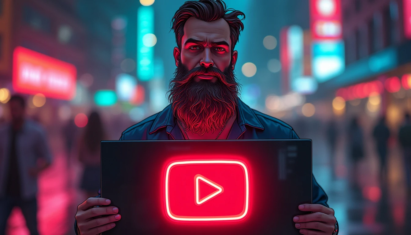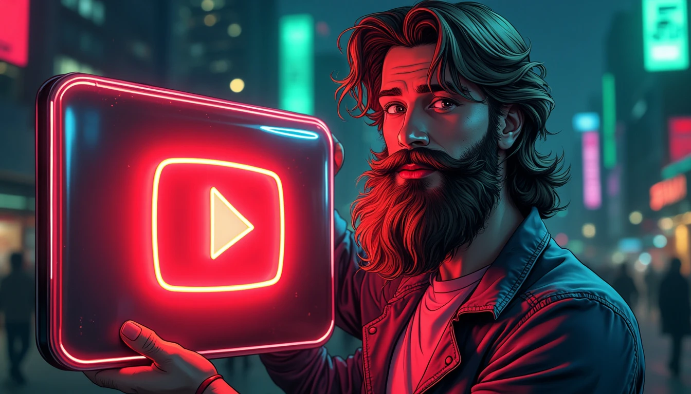 A charismatic man with a long, well-groomed beard stands in the center of the image, holding a large, glowing sign. He’s wearing a casual yet stylish shirt that subtly reflects the lights around him. The man’s beard is the focal point, long and lush, with shades of brown and gray that catch the light interestingly. Tiny, multi-colored neon highlights shine through the strands of his beard, creating a mesmerizing, surreal effect. He holds a large, rectangular sign in front of him. The sign is made of a shiny, reflective material, such as polished acrylic or chrome-plated metal. In the center of the sign, the YouTube logo is displayed in large format. The logo is rendered in vibrant red neon, gently pulsing and emitting a glow that illuminates the man’s face and reflects in his eyes. The background is a blurred nighttime cityscape, with city lights creating a colorful, dynamic bokeh. Shades of electric blue, deep purple, and lime green punctuate the background, complementing the neon red of the YouTube logo. The overall lighting is dramatic, with spotlights highlighting the man’s facial features and creating interesting shadows that add depth to the image. The colors are rich and saturated, creating a vibrant palette that ranges from the deep red of the logo to the cool colors of the urban backdrop, and the warm tones of the man’s skin and beard. Small details like dewdrops on the sign or stray hairs in his beard catch and refract the neon light, adding an extra level of realism and visual interest.