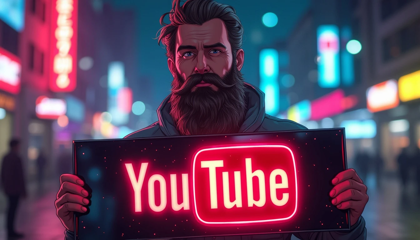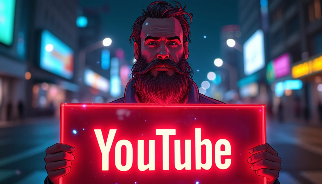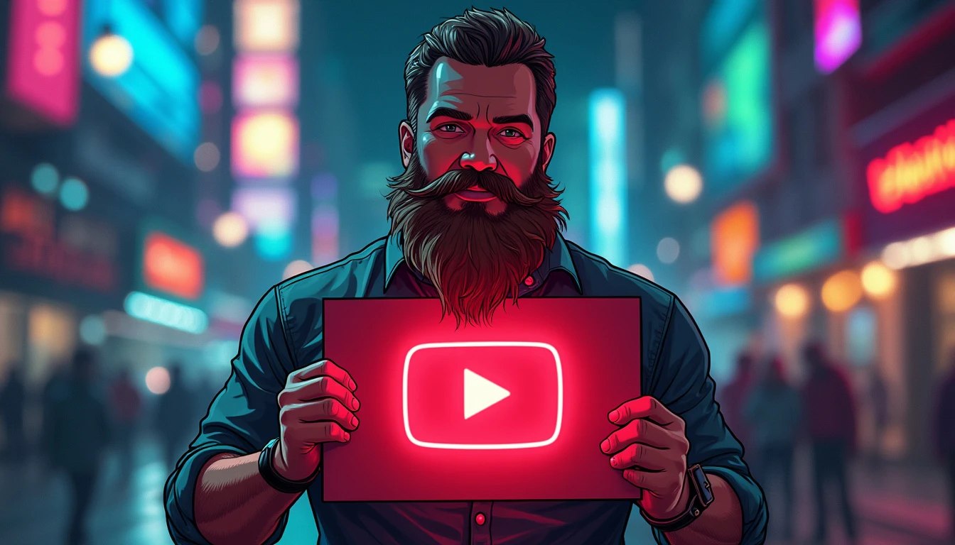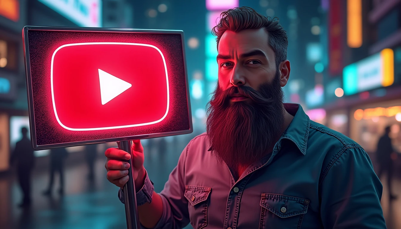 A charismatic man with a long, well-groomed beard stands in the center of the image, holding a large, glowing sign. He’s wearing a casual yet stylish shirt that subtly reflects the lights around him. The man’s beard is the focal point, long and lush, with shades of brown and gray that catch the light interestingly. Tiny, multi-colored neon highlights shine through the strands of his beard, creating a mesmerizing, surreal effect. He holds a large, rectangular sign in front of him. The sign is made of a shiny, reflective material, such as polished acrylic or chrome-plated metal. In the center of the sign, the YouTube logo is displayed in large format. The logo is rendered in vibrant red neon, gently pulsing and emitting a glow that illuminates the man’s face and reflects in his eyes. The background is a blurred nighttime cityscape, with city lights creating a colorful, dynamic bokeh. Shades of electric blue, deep purple, and lime green punctuate the background, complementing the neon red of the YouTube logo. The overall lighting is dramatic, with spotlights highlighting the man’s facial features and creating interesting shadows that add depth to the image. The colors are rich and saturated, creating a vibrant palette that ranges from the deep red of the logo to the cool colors of the urban backdrop, and the warm tones of the man’s skin and beard. Small details like dewdrops on the sign or stray hairs in his beard catch and refract the neon light, adding an extra level of realism and visual interest.