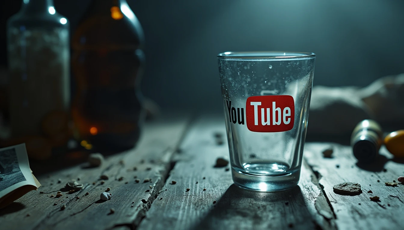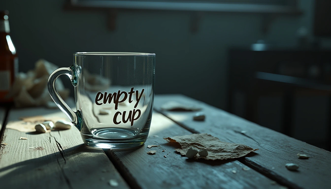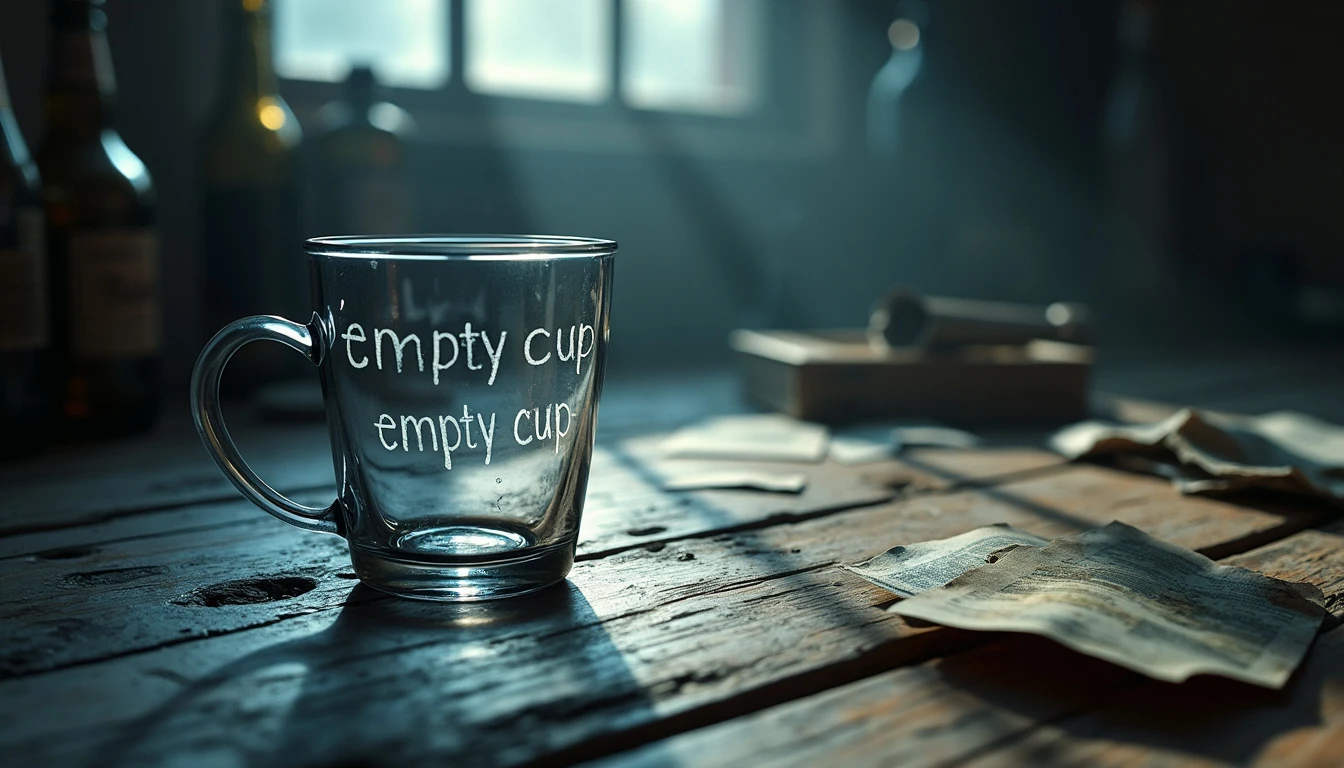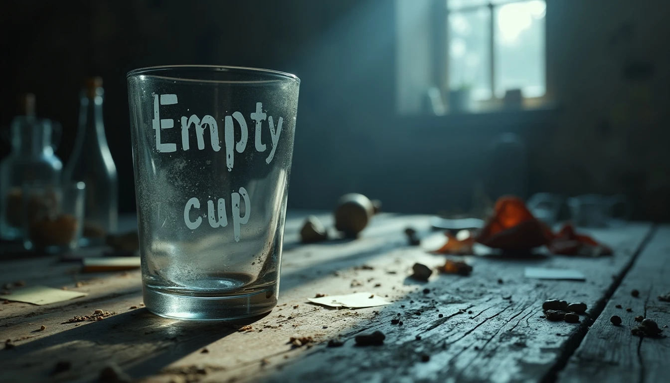 A realistic and emotionally charged image showing an empty glass cup in the foreground with the words empty cup in 3D written on it, placed on a weathered wooden table. The YOUTUBE LOGO should be next to the image. The cup is illuminated by a dim light, which projects distorted shadows on the surroundings, symbolizing emptiness and inner pain. In the background, a dark and blurred environment, with traces of objects such as broken bottles and crumpled photographs, creates an atmosphere of suffering and anguish. The lighting in shades of gray and dark blue emphasizes the feeling of despair and loneliness, while a slight haze effect around the cup gives the impression of unshed tears. The visual ensemble reflects the metaphor of "an empty cup and a life full of pain", conveying a sense of deep sadness and regret.