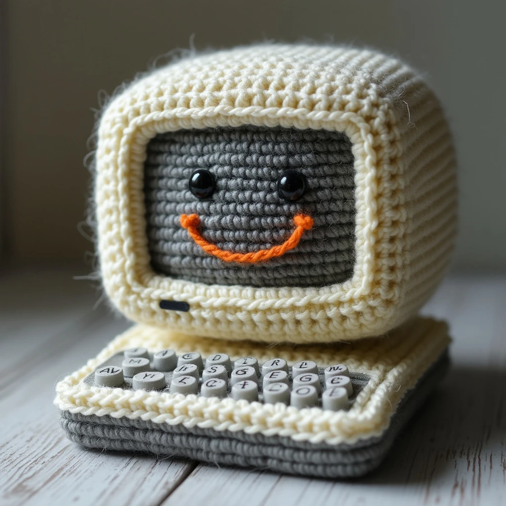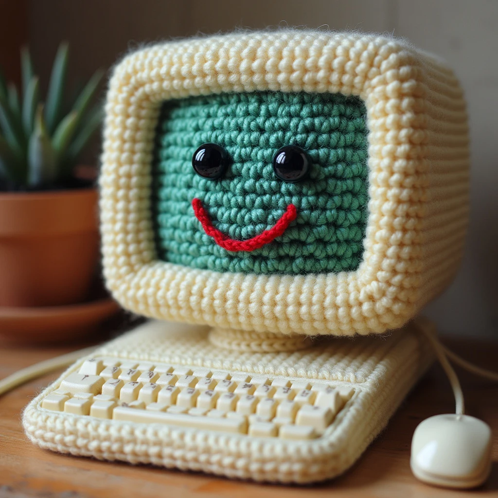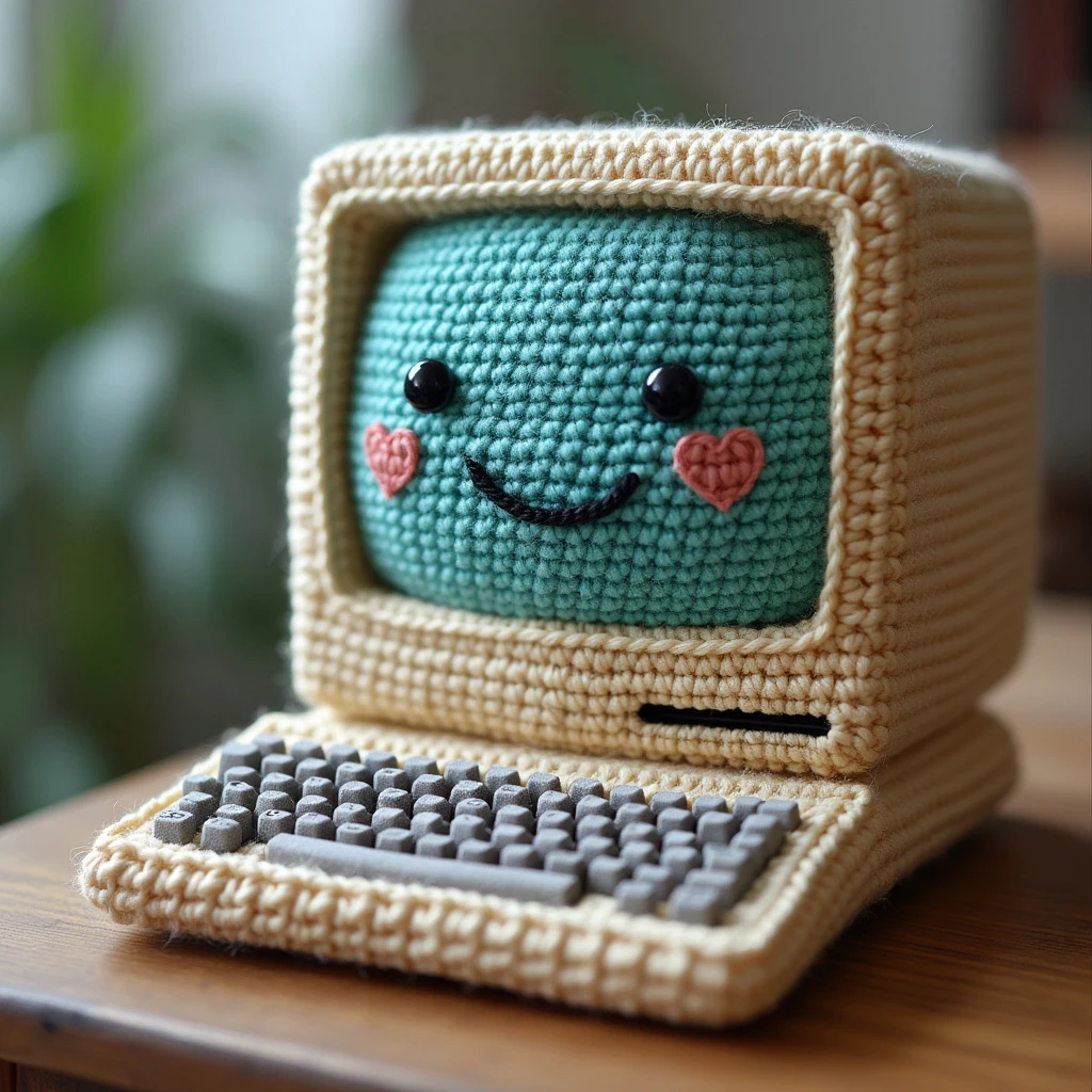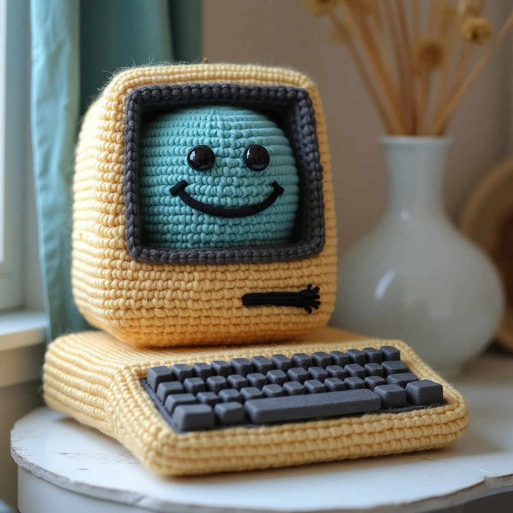 Crochet Apple mac computer first generation a smile face on the screen 键盘和屏幕都是钩针