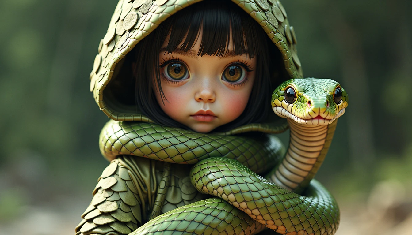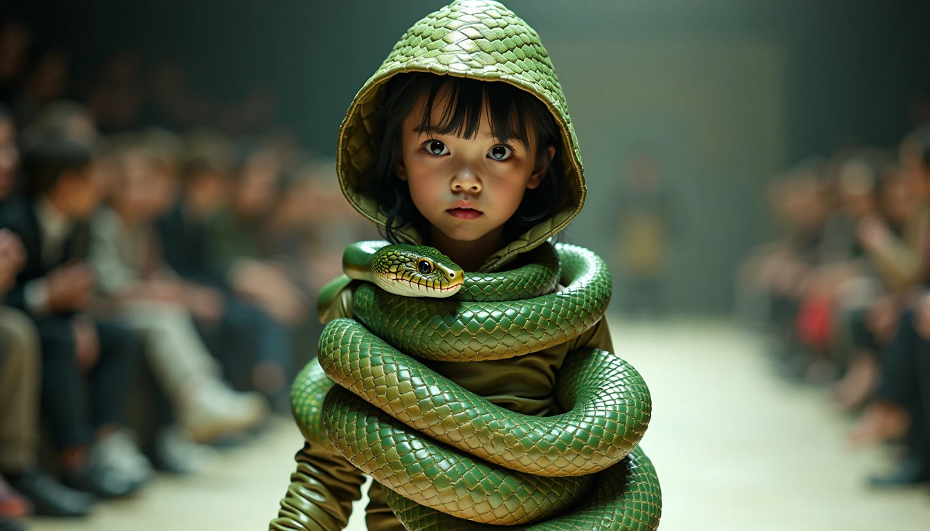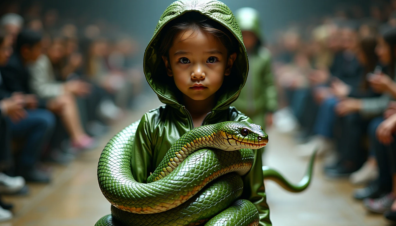 A hyper-detailed and photorealistic image of a young girl, around six years old, dressed in an ultra-realistic snake costume. The costume is intricately designed with smooth, scale-like patterns that shimmer in shades of green and brown, closely mimicking the appearance of a real snake's skin. The child’s costume includes a hood shaped like a snake’s head, with sharp, lifelike eyes and a slightly open mouth revealing small fangs. The child’s arms and legs are wrapped in the same scaly material, adding to the sinuous, serpentine look. Coiled around the child’s arm is a real, life-like snake, about one meter long, with scales that match the child’s costume in color and texture. The snake’s body is wrapped gently around the child’s arm, its head resting calmly near the child’s hand as they walk down the runway. The snake’s skin is rendered with incredible detail, showing the smooth, reflective surface of each scale and the subtle movements as it adjusts its position. The image captures the sleek, fluid motion of both the child and the snake, with the snake’s natural size and movement adding to the realism. Every detail, from the child’s focused expression to the snake’s calm, watchful gaze, is rendered with such precision that it looks like a real photograph taken during a live fashion show, perfectly showcasing the harmony between the child and the serpent.