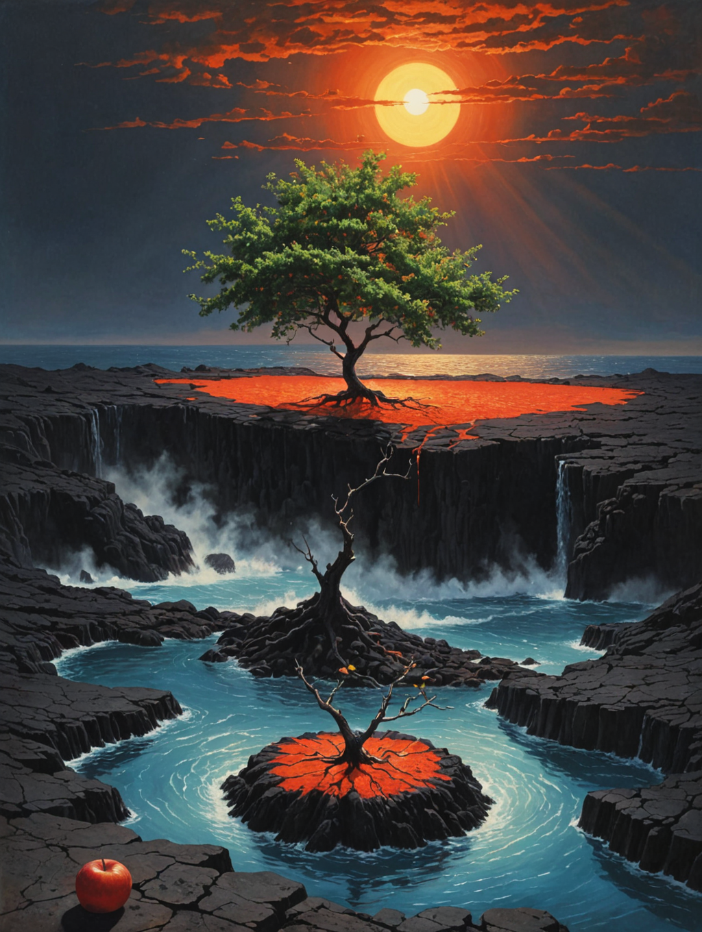 painting, seascape, lava pit and Apple tree background, (by Vija Celmins:1.0) , Fairy-Tale, avant-garde, dramatic lighting, Cathode tube, Crepuscular Rays, pixiv, painterly, highly color focused, highly complex, cool colors, complimentary colors, dynamic cinematic perfect background