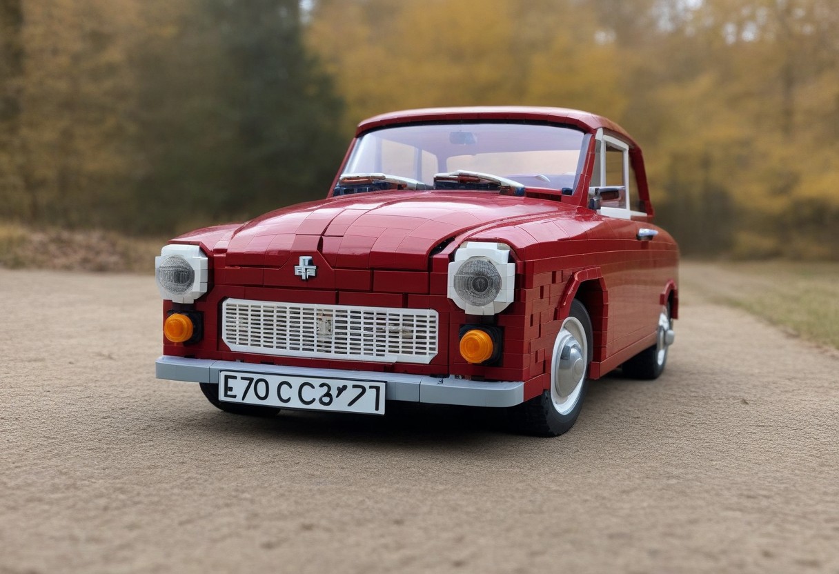 cinematic wallpaper, concept art :60s polish compact car made entirely out of Lego bricks, vibrant colors, detailed construction, nostalgic feel, by Lego artist Nathan Sawaya. negative space, indoor, high key photo, legendary quality