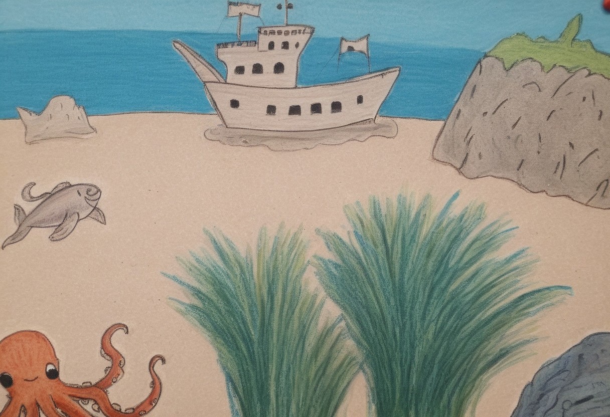 smiling octopus, old sunken ship, ocean floor, fish on the background, Algae and rocks, detailed foreground, cute doodle, Simple Drawing, illustration, cut out cartoon, stopmotion, paper doll, high details, crayon drawing