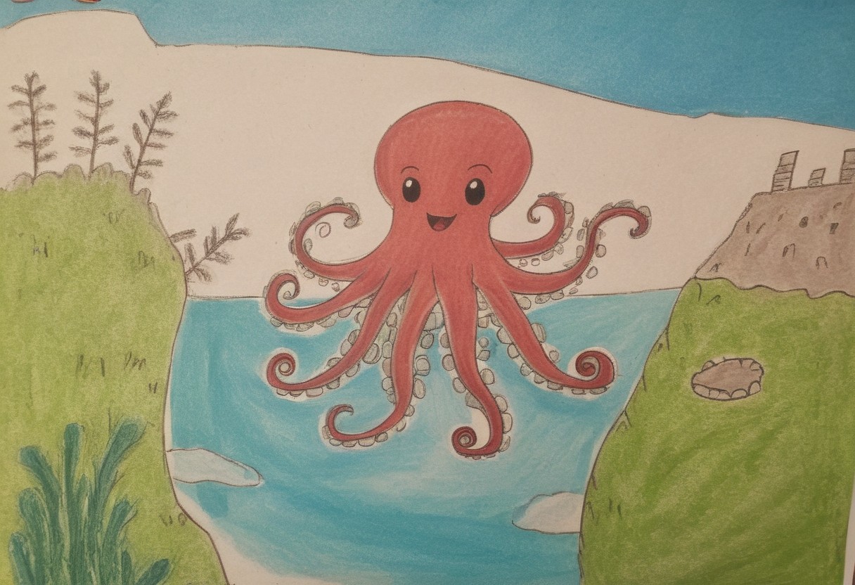 smiling octopus, old sunken ship, ocean floor, fish on the background, Algae and rocks, detailed foreground, cute doodle, Simple Drawing, illustration, cut out cartoon, stopmotion, paper doll, high details, crayon drawing