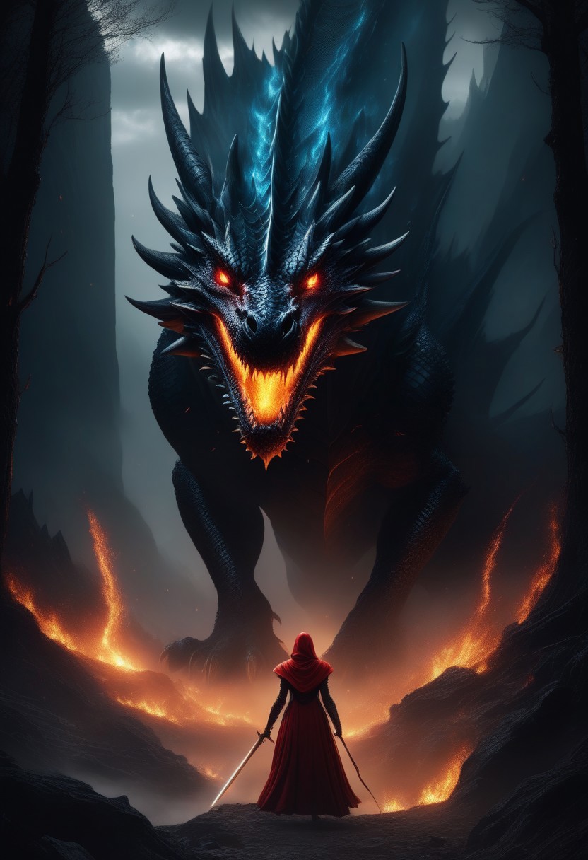Dark clouds in the sky, incoming storm, flashes of lightning , desolate land covered by rocks and snow, few broken trees, mountains in the background, snow storm with particles floating, hyperdetailed BREAK backdrop, unfazed dragon, A massive, fearsome dragon with obsidian-black scales and (glowing blue eyes), its wings outstretched in a menacing display. Dragon has powerful legs with sharp claws, the dragon's scales glisten in the dim light, reflecting a fiery glow from the (blue flames it breathes) BREAK ((middle ground, desorganized army of undead, some have armor, some have only clothes, glowing eyes, standing, facing viewer)), BREAK foregound , woman, alone in foreground, priestess, red dress, red cape, red hood, hood is up, woman holds a flaming sword, clothes flowing in the wind, rear view, looking at dragon, ready to engage combat alone versus dragon and undead, BREAK dark fantasy atmosphere, ominous, low key, volumetric lighting, cinematic composition, wide shot, realistic scenery, intricate details, ultra high quality, very detailed