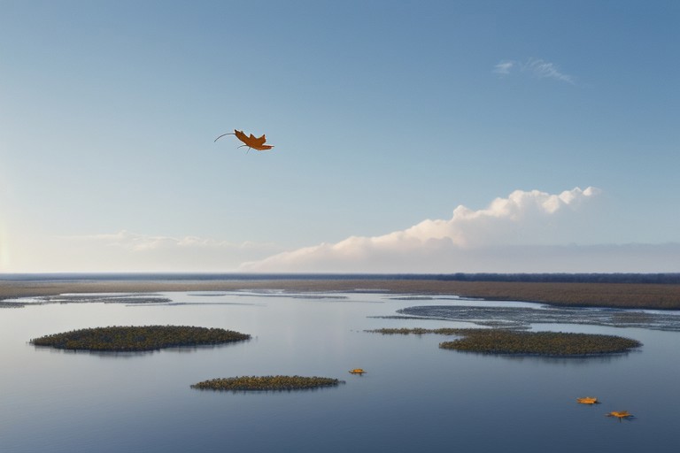 overlooking blue grasslands, greenish tint sky, with yellow leaves plants, marshland, yellow colored marshland, water is yellow color, sky is tinted green with white cirrus clouds, sulfurous feel, yellowish mist rising, ((floating blue bulbous leaf plants)), ((floating blue leaf plants scattered in the air))