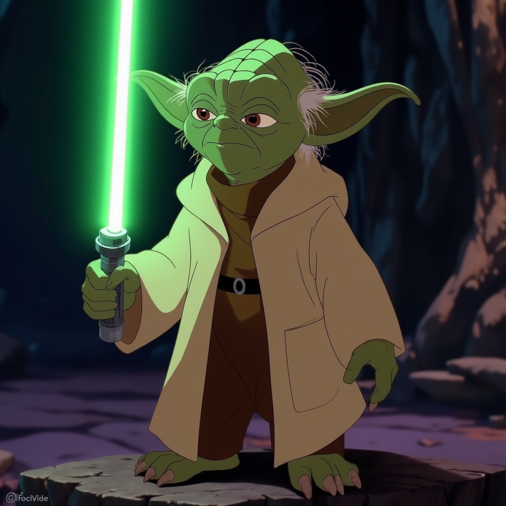 egdisney, Star Wars Yoda with a light green light saber, action pose, standing on a spaceship dark background, detailed clothing, Green skin, wrinkles