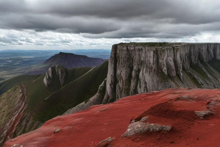 ((overlooking an exotic alien alpine landscape)), White Cliffs of Dover, rocky cliff side is white, cliff side overlooks red sand, red sand dunes below, cloudy skies, white stalagmites forming from the ground