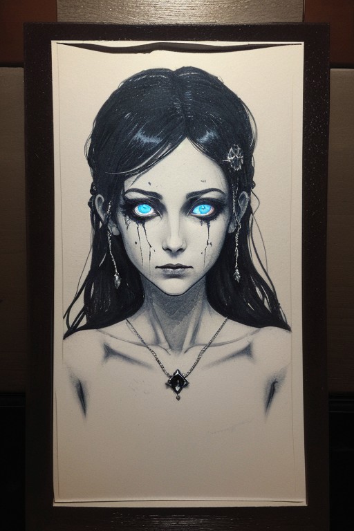alcohol black and color illustration on parchment. Precise. A ghostly female silhouette. Messenger of Ice God. Undead. Canvas clothes. seductive. Runic circle. Elements. Ice from inside. Glowing eyes. Bokeh blur. BadDream.