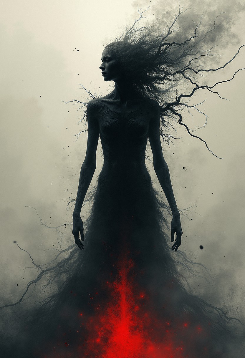 a digital artwork in the style of grunge or dark fantasy, featuring a predominantly monochromatic palette with shades of black and gray, with a central figure that appears as a humanoid form with intricate smoke-like details and tendrils or branches resembling a plant-like appearance, set against an abstract chaotic background and with a vibrant colored area at the bottom