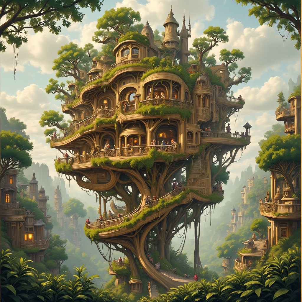 Illustration of fantasy treehouses that merge into a cityscape, architecture, music, forest, evangsurreal, mecha, greg rutkowski