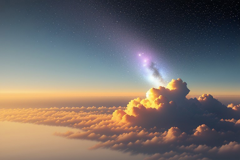 A captivating 3D render of a cinematic illustration with a mesmeric gradient background of sky blue to golden yellow,resembling a stunning sunrise sky. Delicate, wispy cloud patterns in white add depth and texture to the sky. Sparkles or stars are scattered across the image, creating a magical, eye-catching effect. With Image carnatic singer M S Subhalakmi in the center