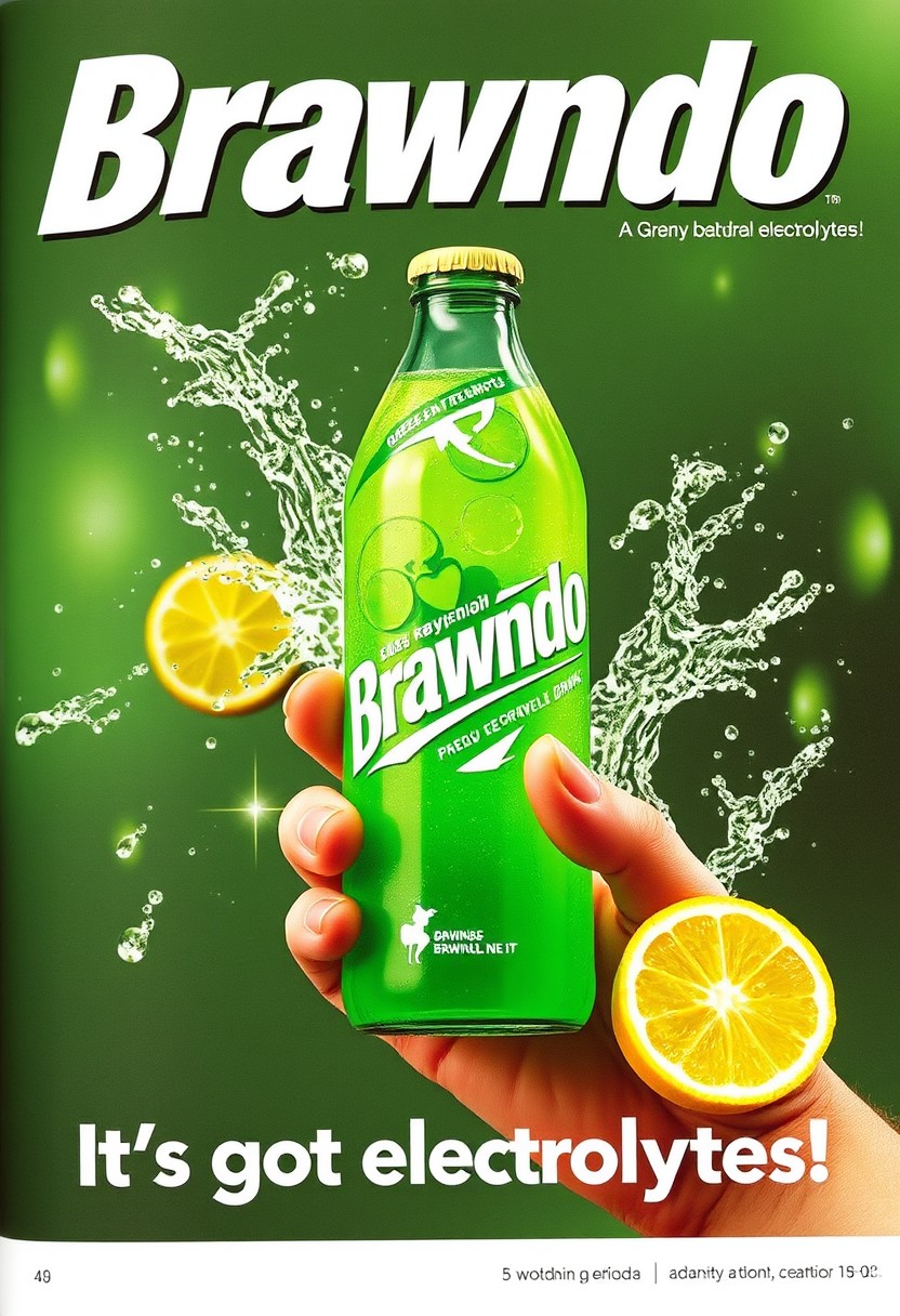 A gaudy magazine ad for a green energy drink called Brawndo, subtitle: It's got electrolyytes!