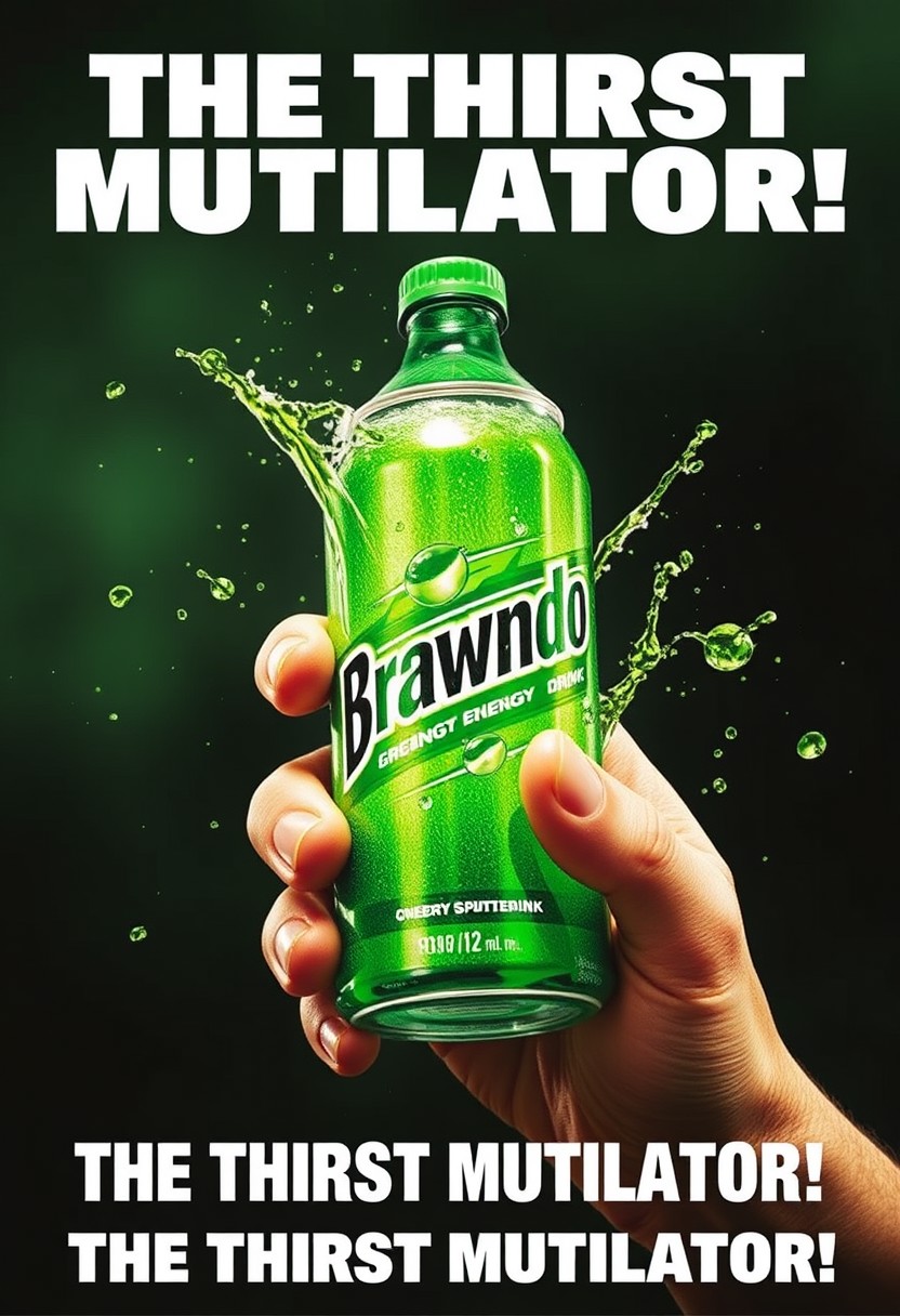 An aggressive ad for a green energy drink called Brawndo, subtitle: THE THIRST MUTILATOR!