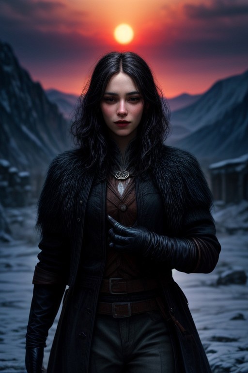(masterpiece:1.2), (best quality,:1.2), 8k, HDR, ultra detailed, ((photorealistic)), cinematic lighting, cowboy shot, depth of field, Lord of the Ring, dark fantasy, woman vampire hunter, sperfect face, perfect hands, eye contact, realistic face, realistic eyes, background ancient ruins in snow covered mountains at sunrise,