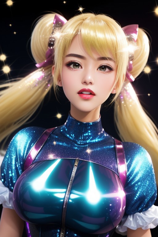 (samus aran) dressed in (puffy pink latex kanamemadokaoutfit), (blonde girly twintails), gigantic breasts, magical girl, masterpiece, best quality, (perfect face, beautiful face, symmetric face), (sparkles, sparkling hair, sparkling clothes, sparkles around face:1.3), (shiny glossy translucent clothing, gleaming oily latex fabric :1.1)