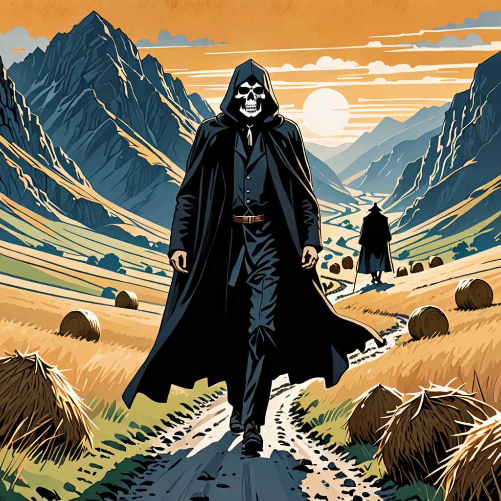 Death walking down a valley, haystacks can be seen in the background, blurred background, amusing illustration, style reminiscent of Terry Pratchet's books, death in a long coat, death shown from the front. He has a torn cloak on his right hand, through which a piece of bone shines through. From under the hood a skull and glowing eyes can be seen