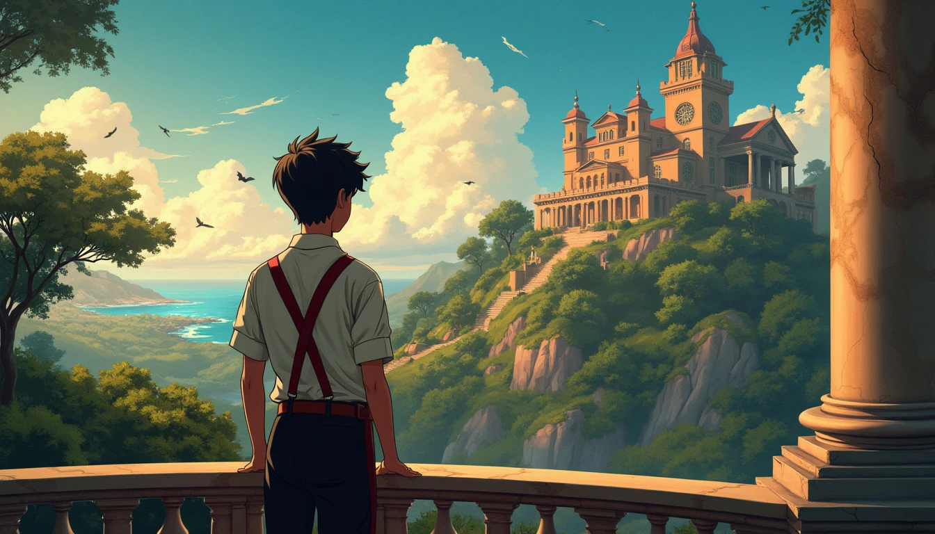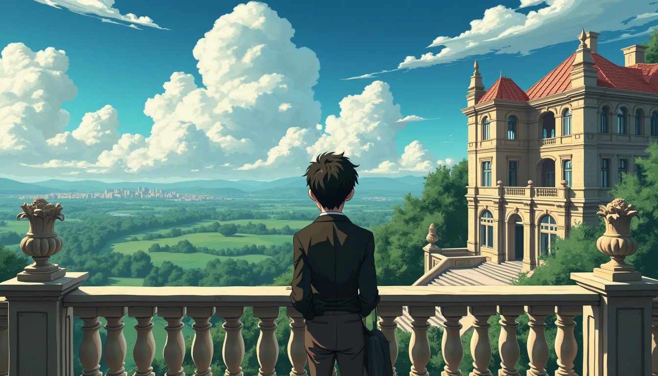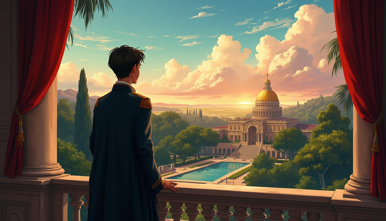"Hyper-realistic, REAL LIFE, CINEMATIC scene of young Bolívar observing the world from the balcony of his family's grand estate.