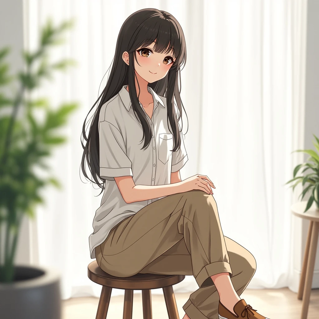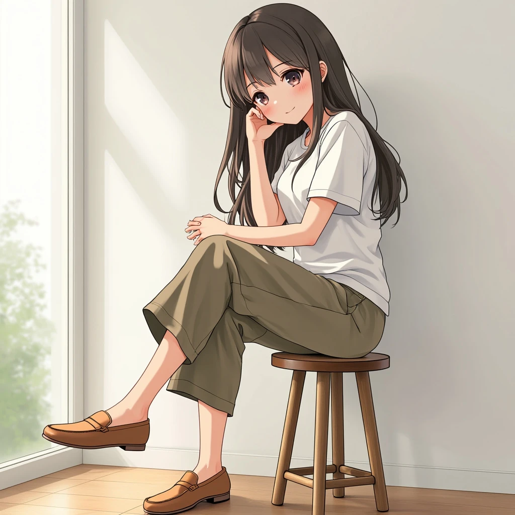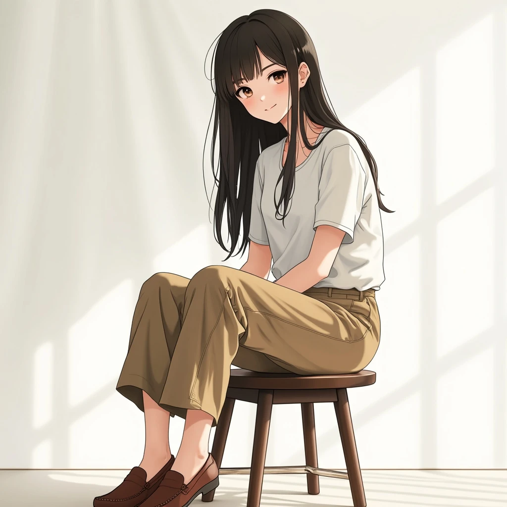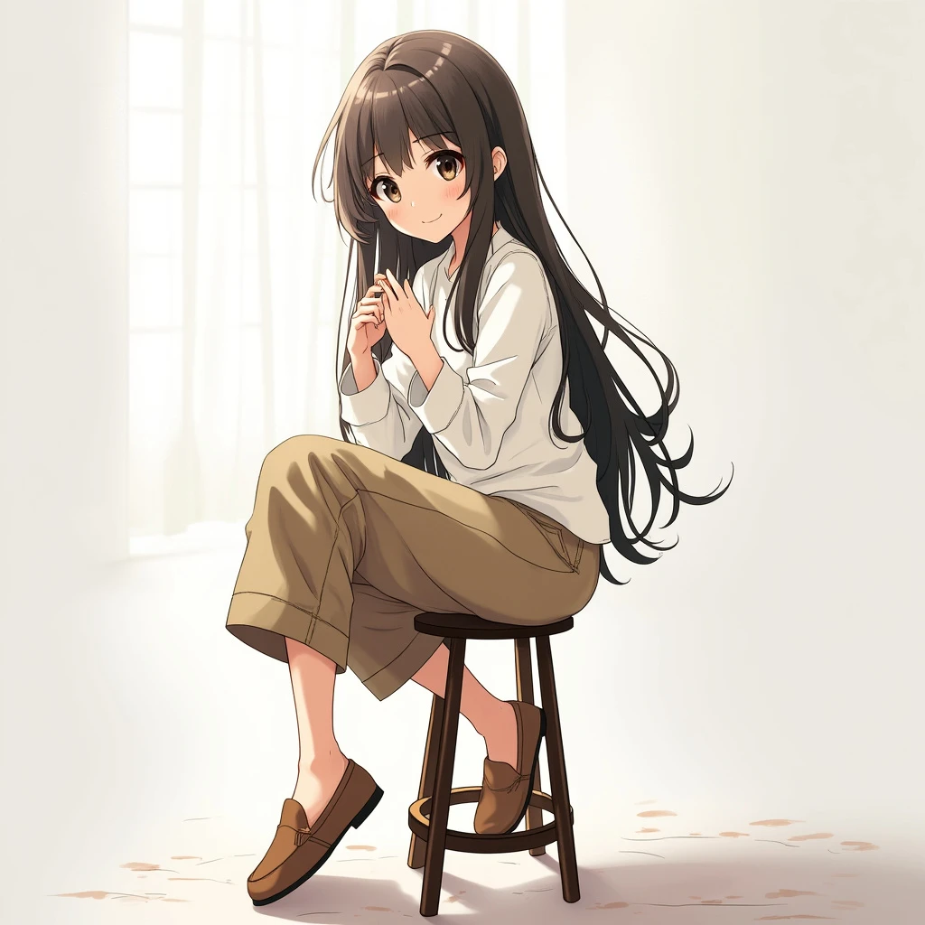 One girl, long hair, model, white background, white shirt, khaki Capri pants, khaki loafers, sitting on a stool, lazy pose, slightly tilting head, smiling, Asian beauty, loose-fitting clothes, hands placed in front of body, slightly raised foot, half-body shot, Canon R5 camera style, blurred background, indoor, natural light, some sunlight shining on the face,9:16.