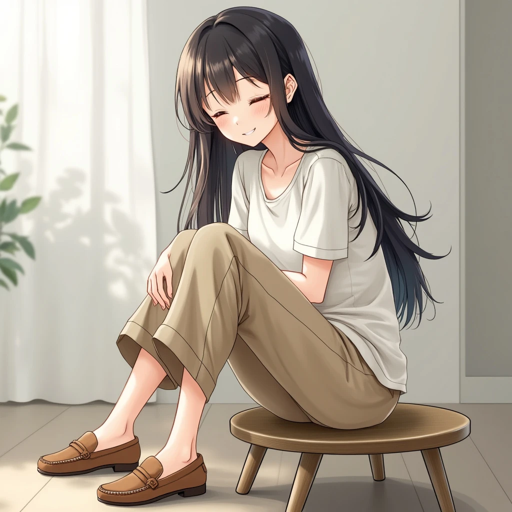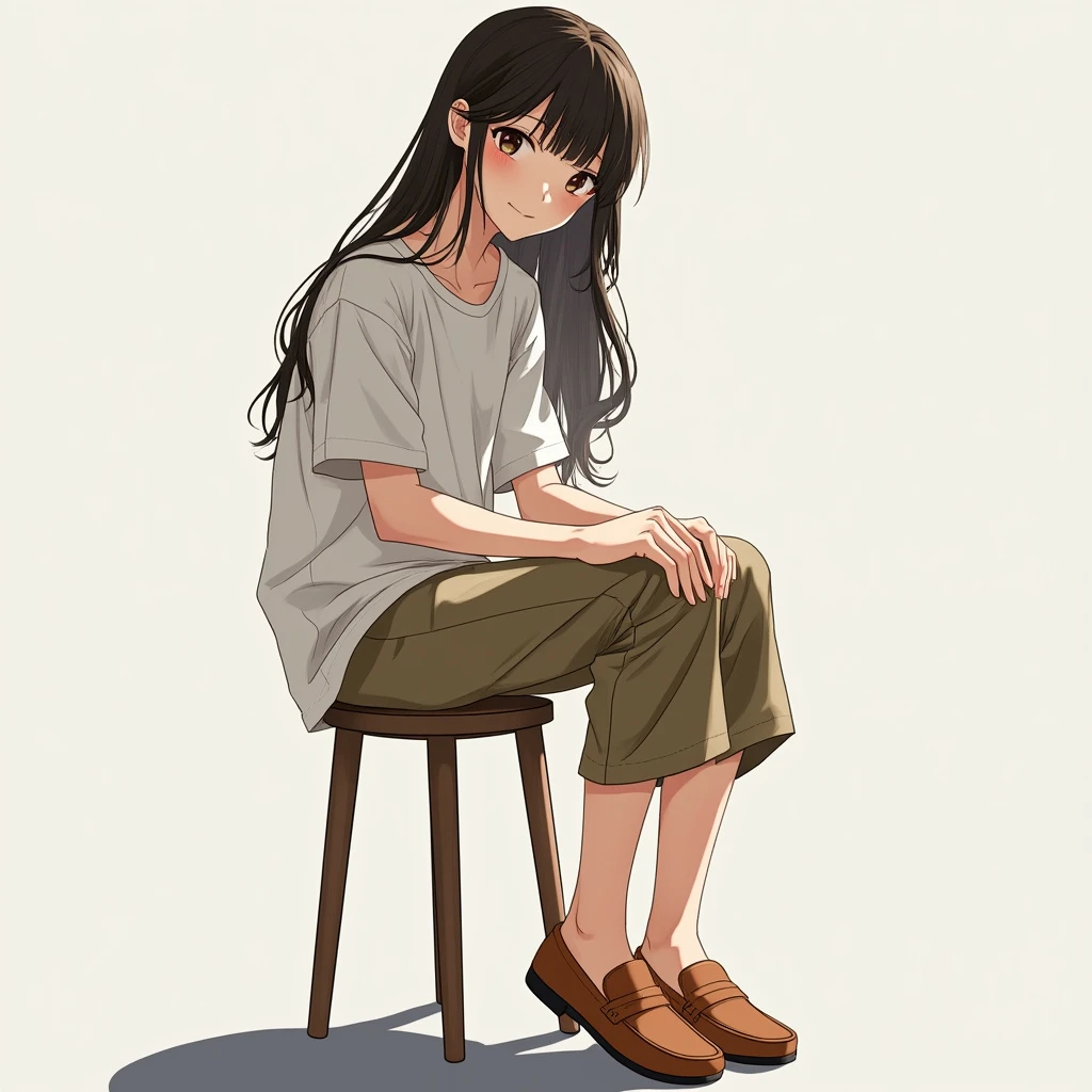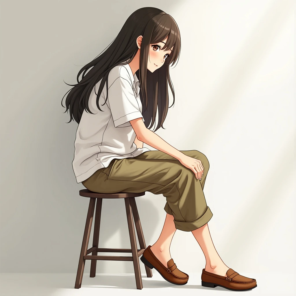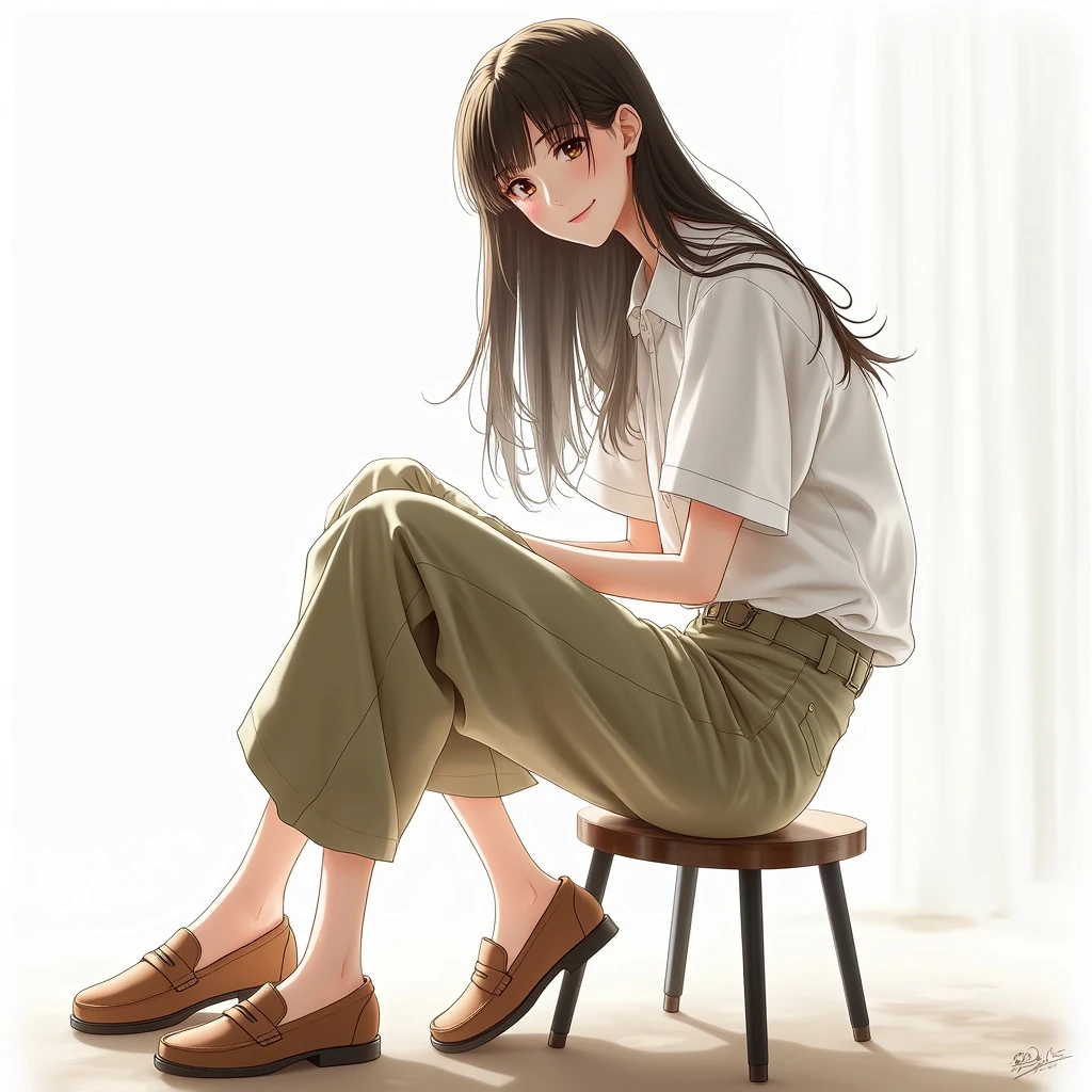 One girl, long hair, model, white background, white shirt, khaki Capri pants, khaki loafers, sitting on a stool, lazy pose, slightly tilting head, smiling, Asian beauty, loose-fitting clothes, hands placed in front of body, slightly raised foot, half-body shot, Canon R5 camera style, blurred background, indoor, natural light, some sunlight shining on the face,9:16.