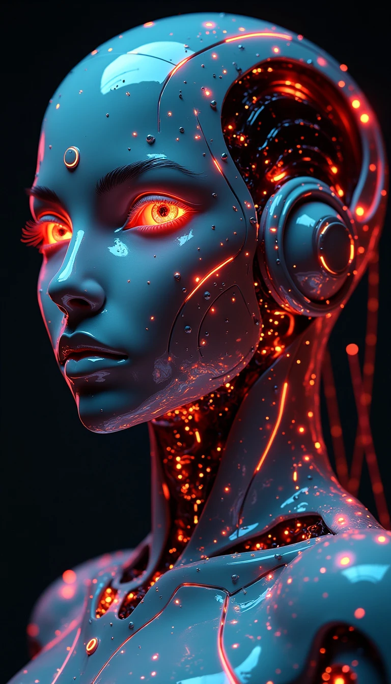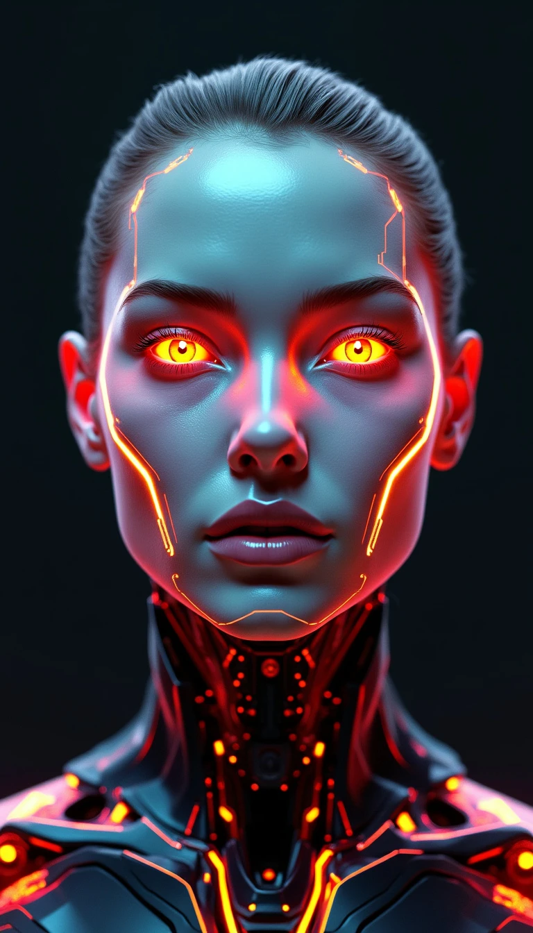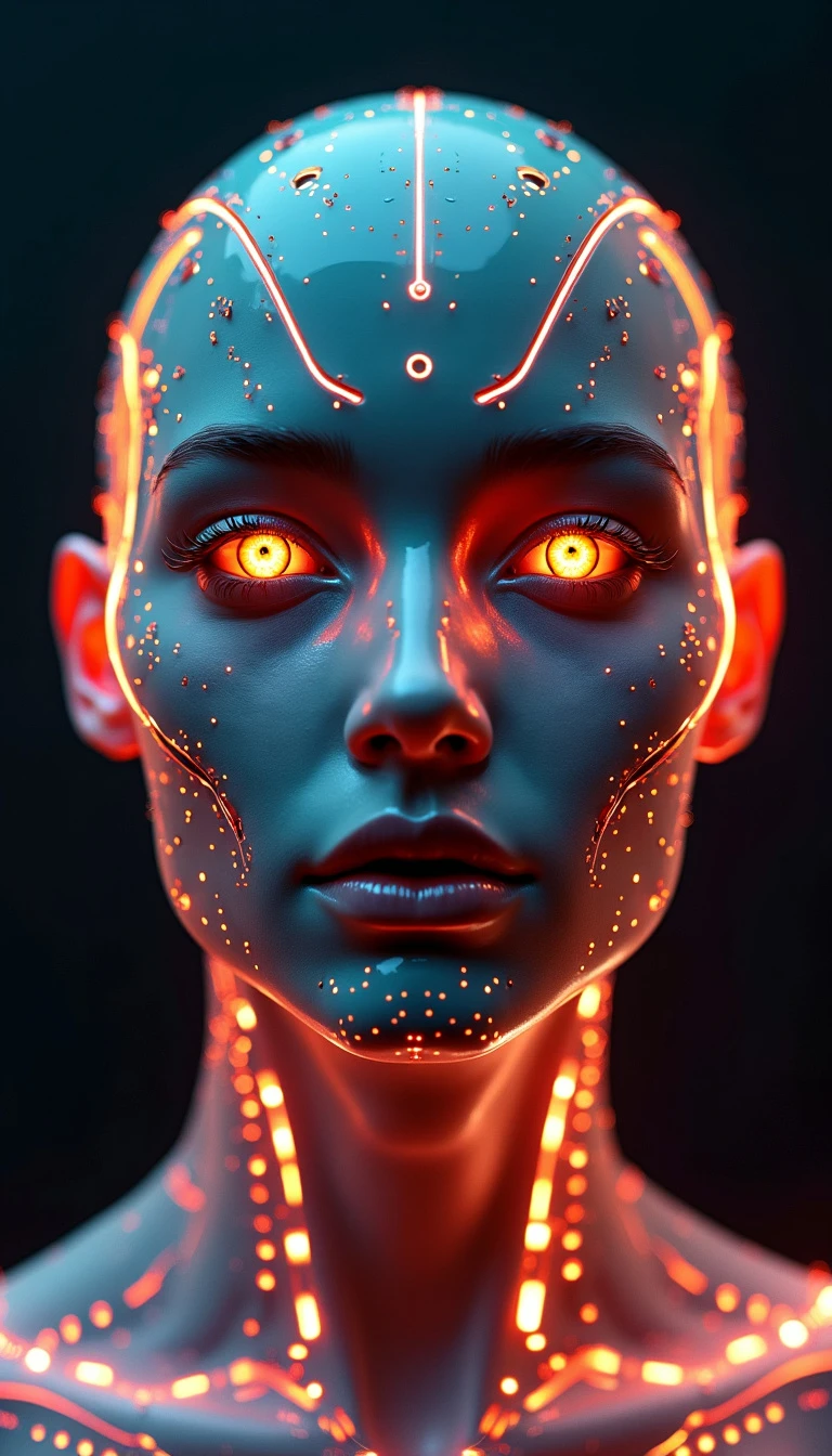 Black background. Portrait of a artificial intelligence in the form of a female digital human with a futuristic cover over the mouth area used for voice translation, facing forward staring directly into the camera. Neon color style. full head must fit into the image.