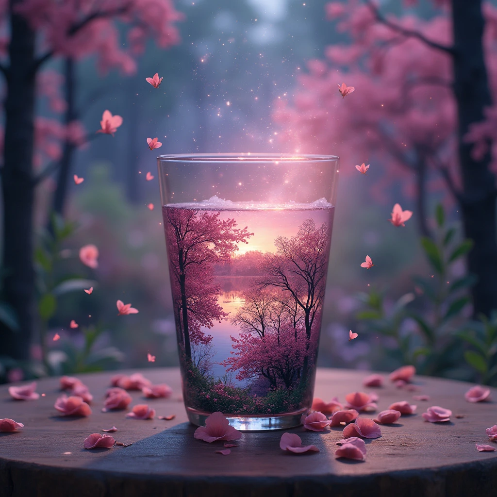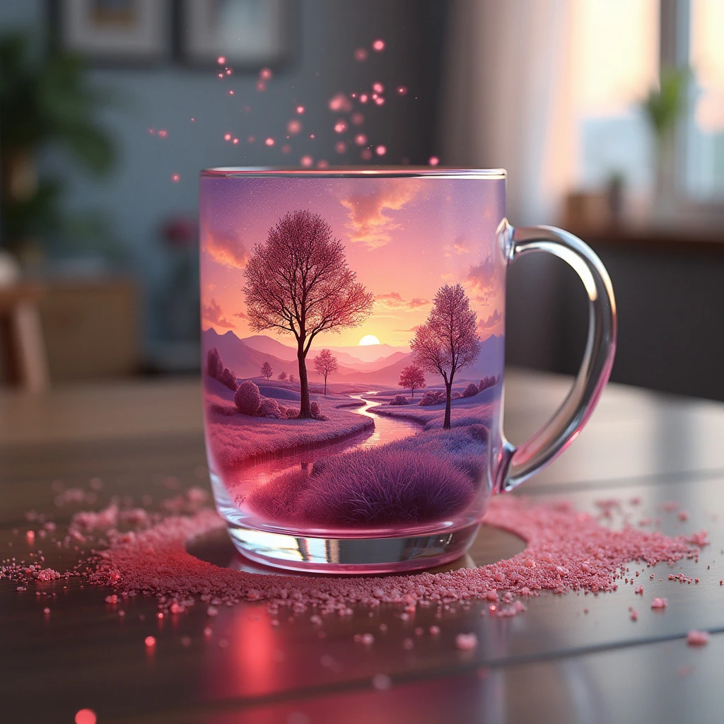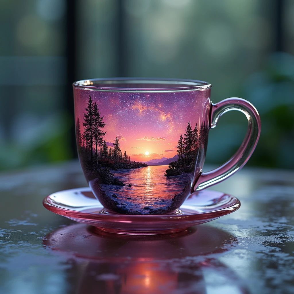 create a table hyperrealistic image of a beautiful scenery nature glass cup landscape, , pink galaxy bottle,