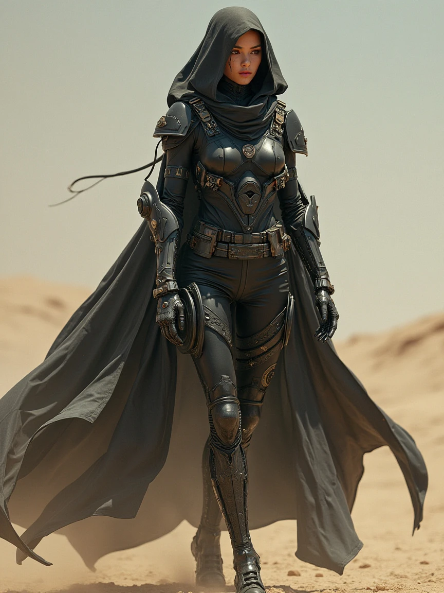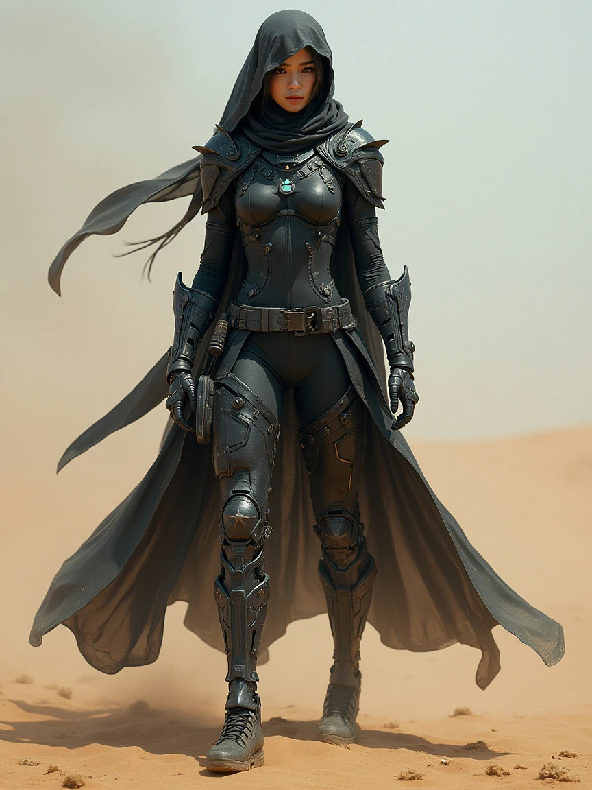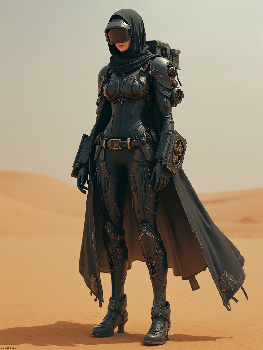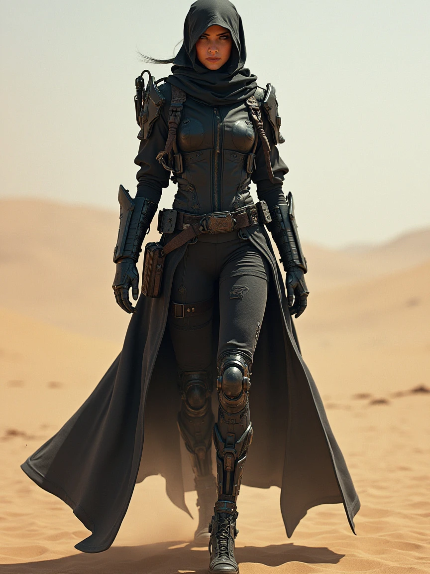 A female character wearing futuristic technological equipment. She wears a visored headscarf, a tight-fitting black battle suit, and various high-tech equipment. Her coat was long and flowing, making her look very majestic. She has mechanical elements on her legs, suggesting she may be a fusion of human and mechanical warrior. The background is a desolate desert scene, giving it a lonely and gritty feel.